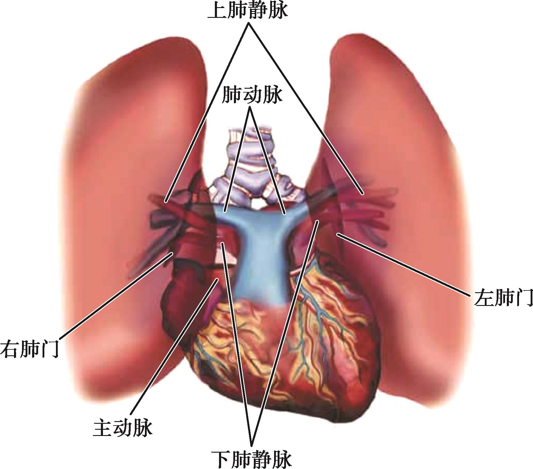 从右心室发出后,肺动脉主干在主动脉弓的下方分出左、右肺动脉,分别进入左、右肺肺门。肺门处有支气管、血管、神经进出。通常肺动脉与气管支气管树伴行,位于支气管的侧后方(图1-3-1)。