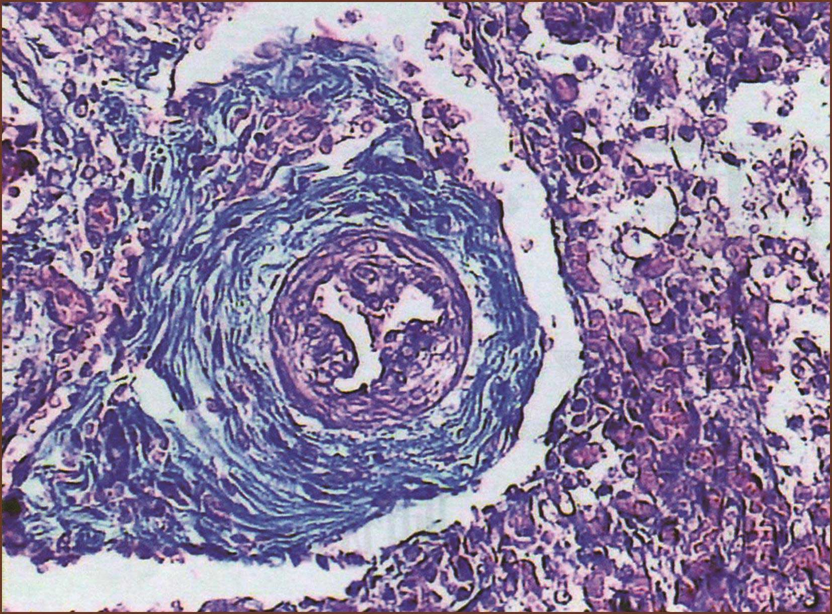 图1-3-8 支气管动脉-肺动脉吻合支(Masson染色,中倍放大)