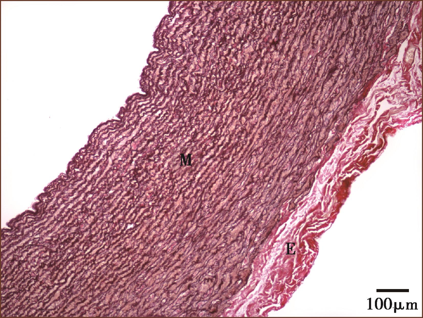 图1-3-2 主肺动脉,中膜(M)含平行排列的弹力板,外膜(E)较薄(ET+VG染色,低倍放大)