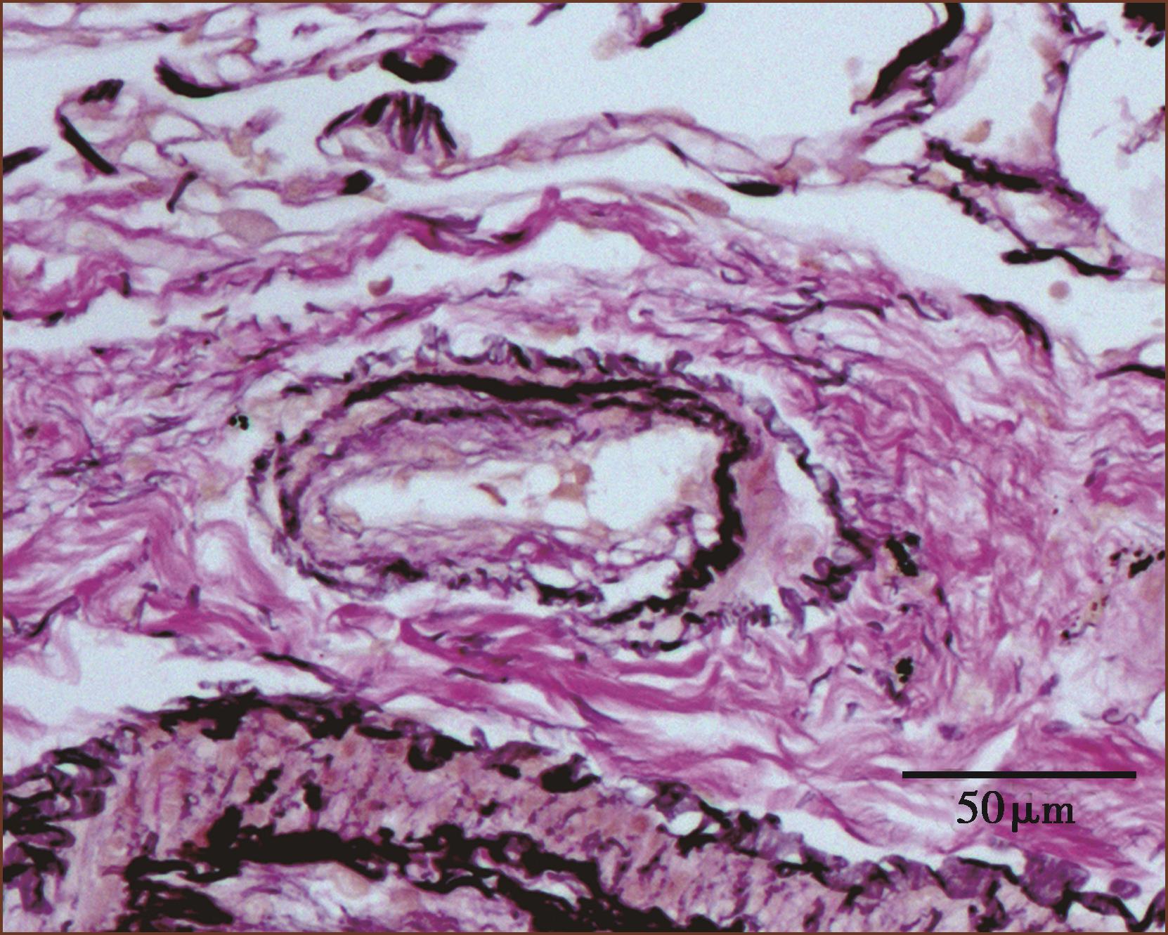 图1-3-7 支气管动脉,内弹力板完整,无外弹力板(ET+VG染色,中倍放大)