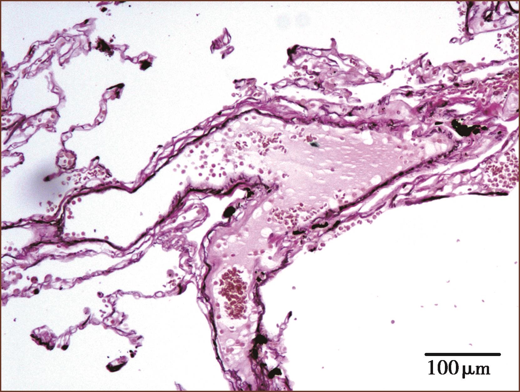 肺组织的老年性改变还可见肺静脉内膜轻度纤维化,肺泡间隔胶原纤维、弹力纤维增多,轻度肺泡性气肿等。