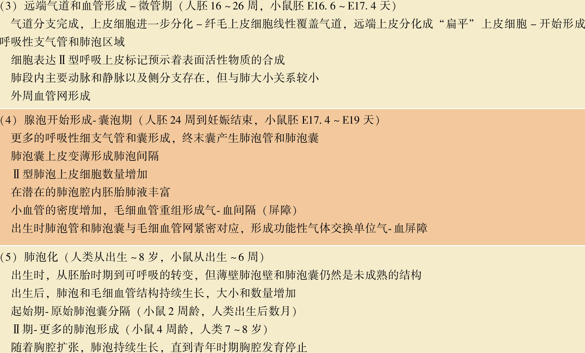 小鼠胚胎发育第8天左右在胚胎前肠腹侧可以观察到与心脏发育密切相关的基因Nkx2-1的表达;胚胎第9.5天,前肠腹侧肺原基开始出芽并突入周围的间叶组织中。肺芽随后分成左右两部分,此后发育成左右肺,这一胚胎发育时期非常短,随后迅速进入假腺管期。在假腺管期原始肺芽膨胀进入间叶组织并开始出芽、分支,这一时期直到胚胎第16.5天。胚胎16.5天后,当支气管树开始形成,肺的发育进入一个新阶段即腺管期。在小鼠,腺管期非常短(16.5~17.5天),此时肺末梢分芽变窄。从胚胎第17.5天起直到出生后5天(P5),肺发育进入微囊泡期,肺泡前体开始形成。最后,从出生后开始,肺泡开始形成直到出生后第14天(P14)。在人类,肺发育遵循相似的时期,但时间表不同。肺出芽开始在胚胎第4周,假腺管期在第6周左右结束,紧接着是微管期(胚胎16~26周),微囊期(胚胎26~36周)和肺泡期(出生后直到3岁,表1-1-1)。