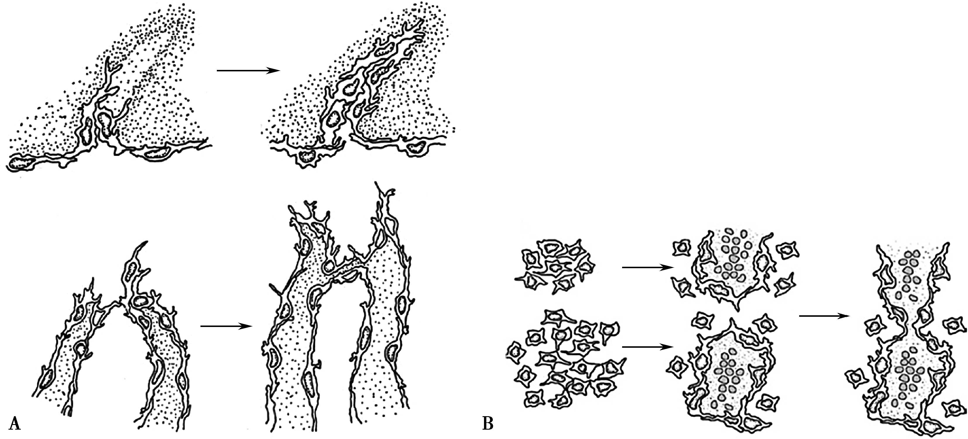 A.套叠过程:毛细血管腔相对的部分向中央生长直至相互接触,双层细胞中央形成穿孔后,内皮细胞相互融合形成跨血管腔的嵴,然后成纤维细胞或血管周细胞长入并加固;B.血管床的生长主要以简单膨胀、血管壁细胞长入和管腔直径加大及管壁延长的方式进行。(A.参考Kurz H,Burri PH,Djonov VG.Angiogenesis and vascular remodeling by intussusception:from form to function.News PhysiolSci,2003,18:65-70;B.参考 Schoefl GI.Electron microscopic observations on the regeneration of blood vessels after injury.Ann N Y AcadSci,1964,116: 789-802)