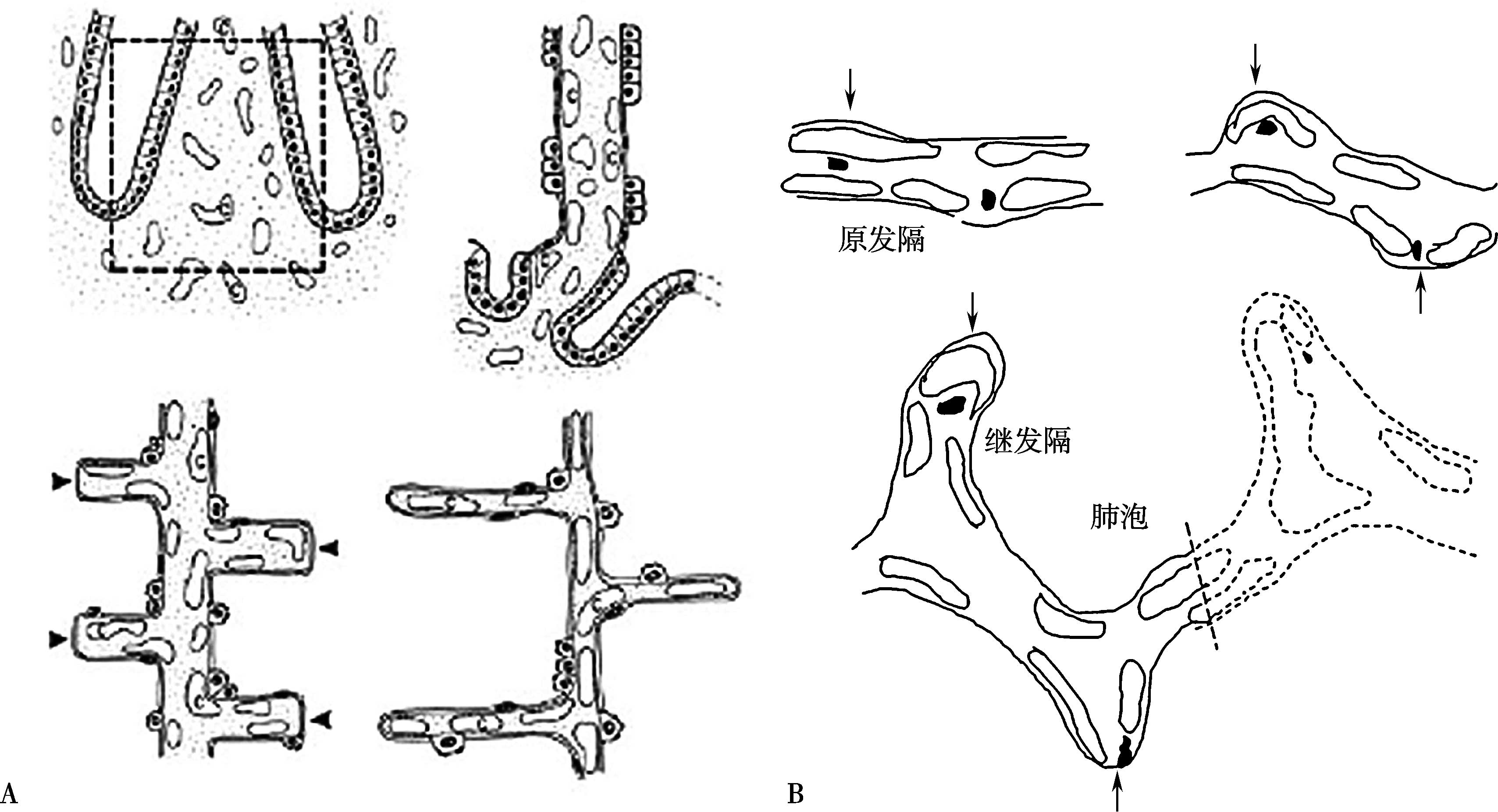 A.在假腺泡期,包含疏松毛细血管网的上皮管道突入周围的间质中(左上),中间的间质减少,毛细血管围绕上皮排列。在上皮-毛细血管接触的地方,部分气血屏障因为肺泡Ⅰ型和Ⅱ型上皮形成而开始变薄(右上),然而在周边的上皮细胞仍然是立方上皮。出生前后,继发隔从原发隔基础上发生(左下,箭头):此时,所有的隔均为原始状态即包含双层毛细血管网和中央的结缔组织层。在成熟的肺内(右下)肺泡间隔包含单层毛细血管网。B.继发隔通过抬起原发隔双层毛细血管网中的一层形成(箭头),弹力蛋白沉积在间质中是肺泡形成必须的条件(黑色区域)。(参考Burri PH.Fetal and postnatal development of the lung.BurriAnnu Rev Physiol,1984,46: 617-628)