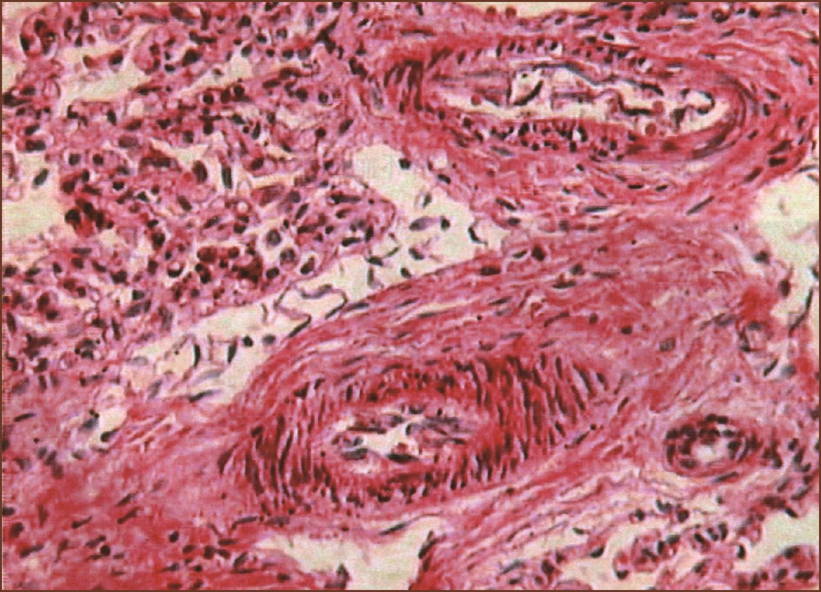 图1-3-12 出生后20天先天性心脏病室间隔缺损,矫治手术后肺动脉高压,呼吸循环衰竭死亡,图示肺小动脉肌层显著增厚,有PPHN(HE中倍放大)