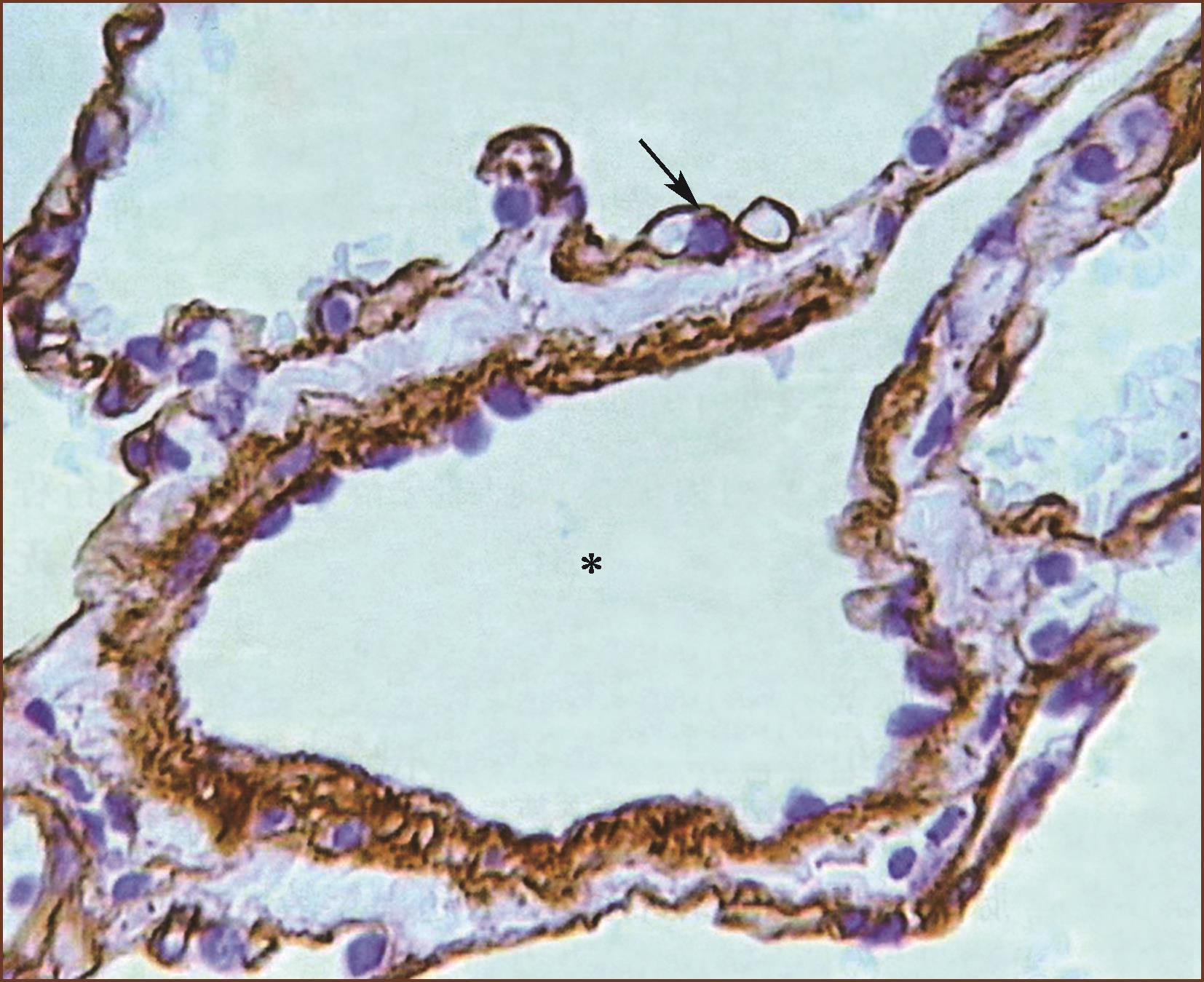 图1-3-9 为Ⅳ型胶原显示一支肺小静脉(∗)及邻近的肺泡、肺泡毛细血管(箭头所示)(免疫组织化学PAP法,中倍放大)