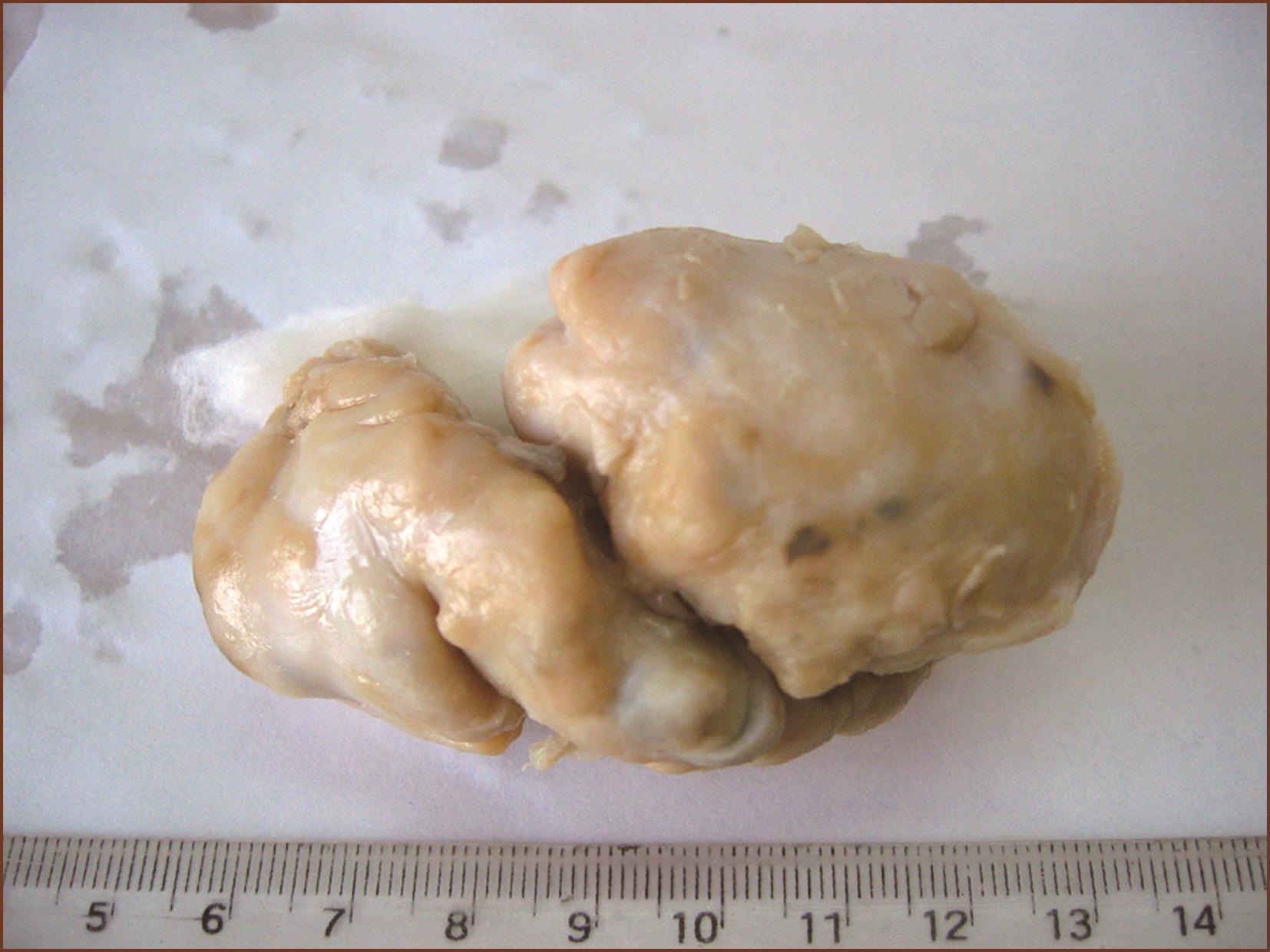 患者,男,45岁,胸闷、气急2年,晕厥1次。因行心肺胸片X线照相、右心导管、超声心动图、放射性核素肺灌注显像、超高速CT检查,均诊断为慢性肺栓塞,重度肺动脉高压,肺源性心脏病。一直在内科按慢性肺栓塞诊治,2年间住院2次,第一次住院时被放置了下腔静脉滤器。因内科治疗未能阻抑病情发展,第2次住院由内科转外科行肺栓塞手术治疗。心外科手术发现肺动脉及分支为肿瘤样组织占据,手术摘除肺动脉树枝状肿物,行肺动脉瓣置换。术后病情改善出院。