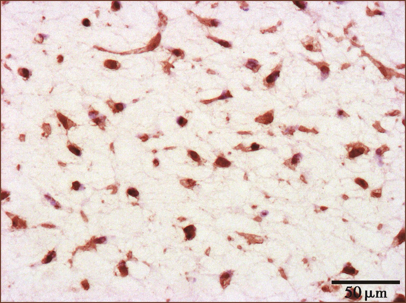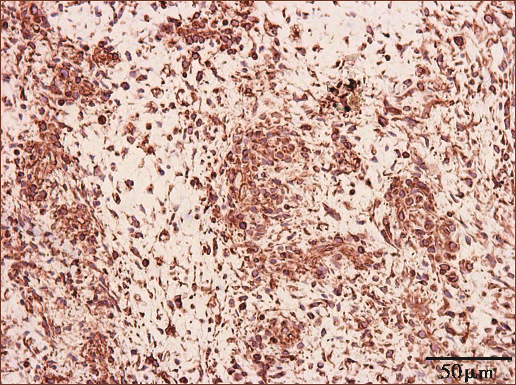 图3-3-10 内膜肉瘤肿瘤细胞SMA阳性(免疫组织化学SP染色,中倍放大)