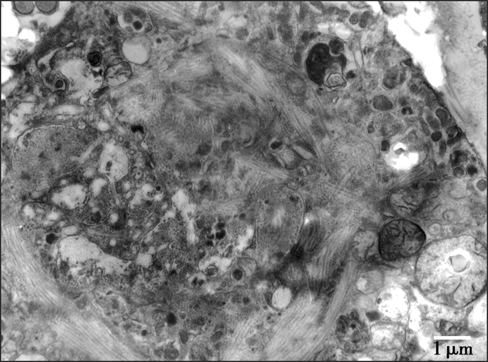 图3-3-11 透射电镜示内膜肉瘤肿瘤细胞内含有大量微丝,符合肌纤维母细胞分化(TEM)