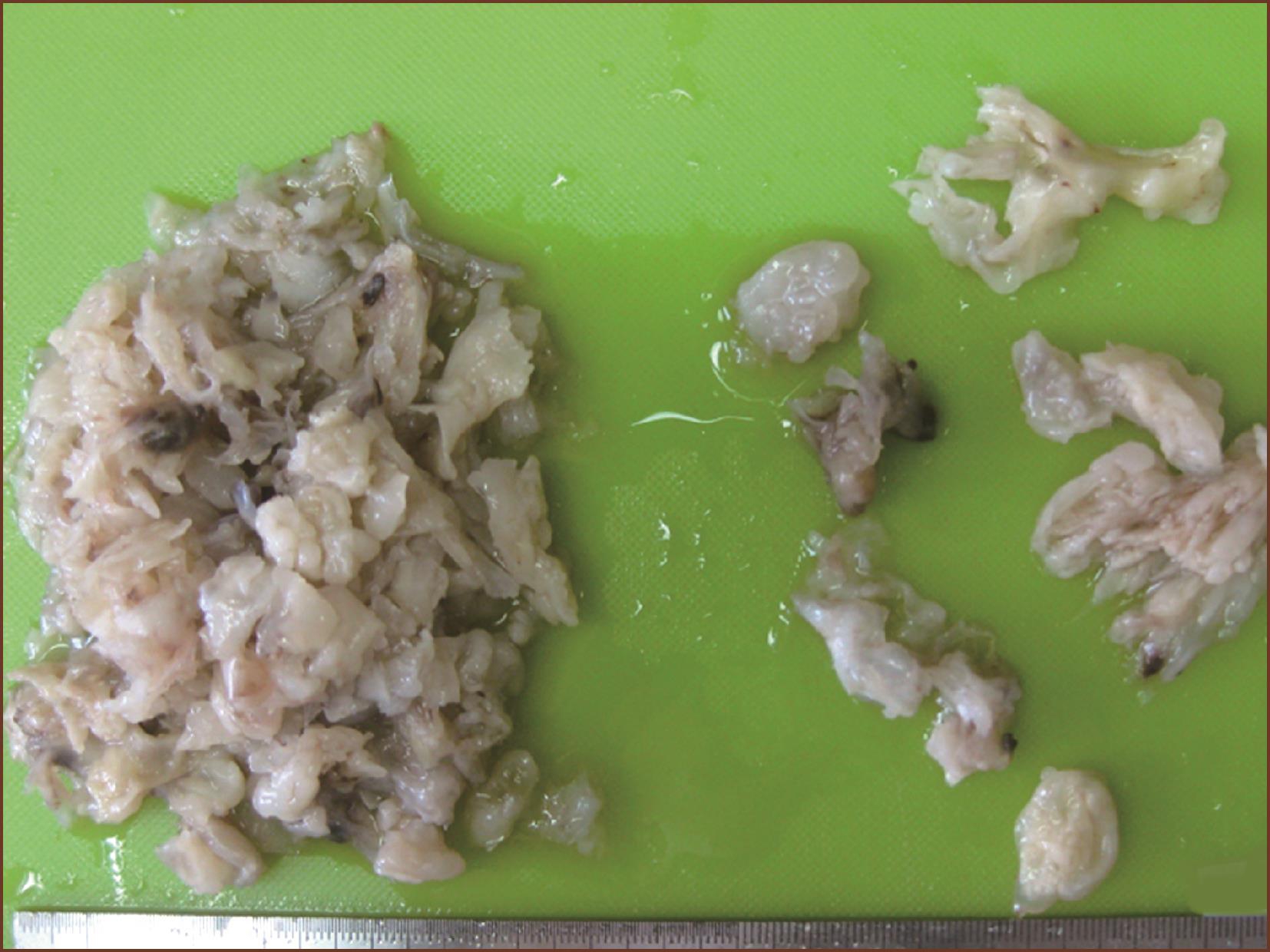 图3-3-6 肺动脉内膜肉瘤,肿瘤组织呈细乳头状,半透明胶冻样