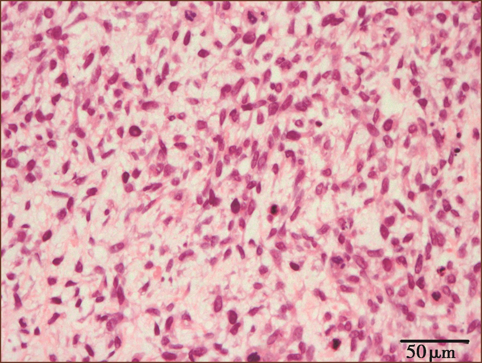 图3-3-8 内膜肉瘤,肿瘤含有较多黏液样基质,瘤细胞呈梭形,异形性明显,可见核分裂像(HE染色×中倍放大)