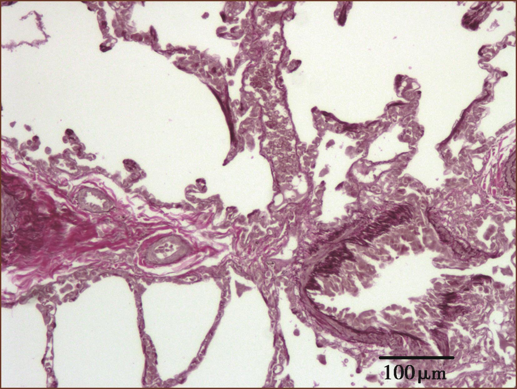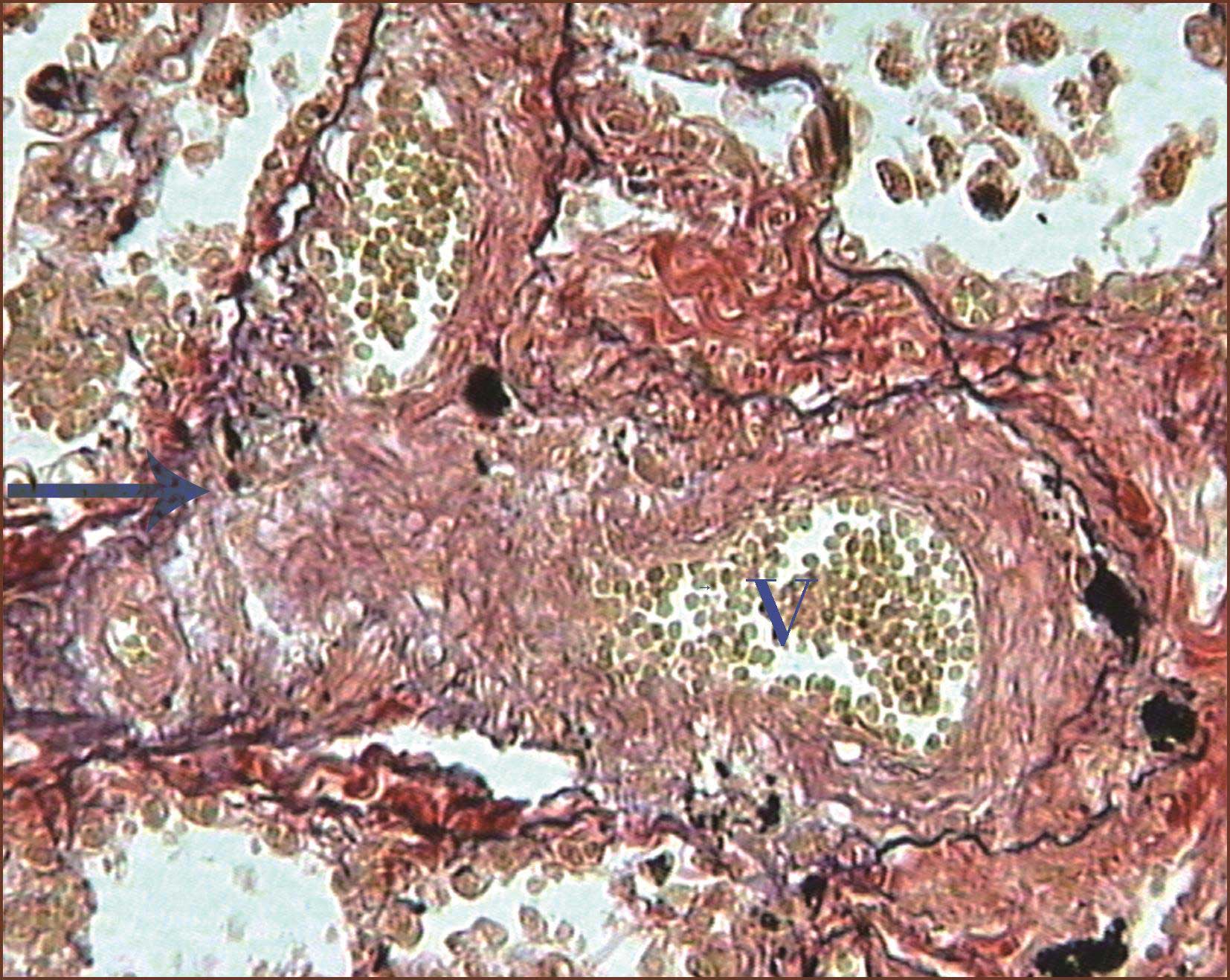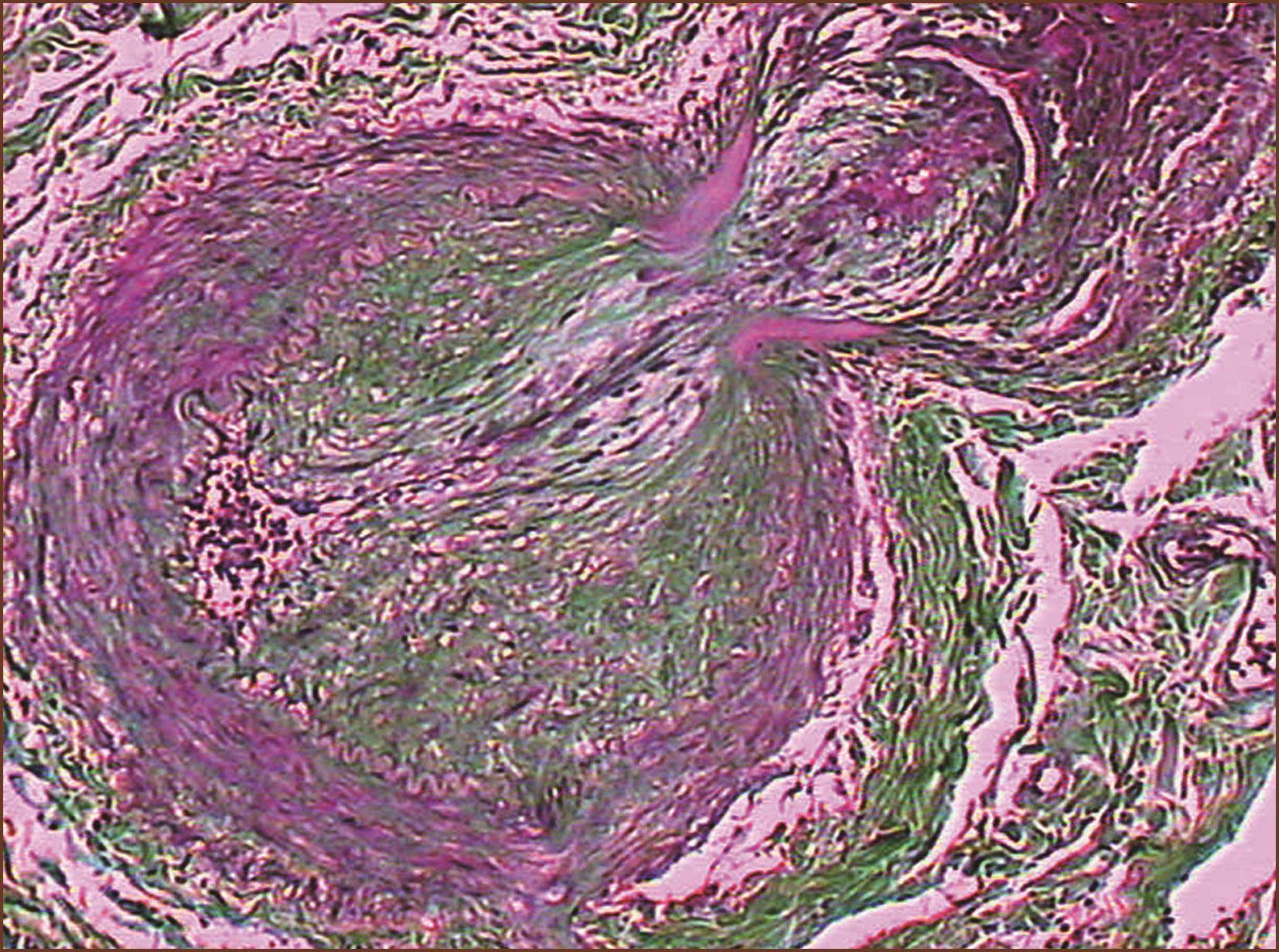 肺小动脉纤维肌性结构不良患者临床及影像学检查表现为不明原因的肺动脉高压。光镜组织学检查,发现肺肌型动脉中层肥厚,中膜肌纤维、胶原纤维及弹力纤维异常不均匀增厚,连同内膜层呈乳头状(图3-1-17)或锯齿状突向动脉腔,或在动脉腔内迂曲,使动脉腔被填塞呈裂隙状。但未见丛状病变、血管炎。邻近肺组织、气道无明显病变。此种异常肌肉、弹力纤维、胶原纤维束发生在肺小动脉的中膜层,称为肺动脉纤维结构不良的中膜型,如发生在内膜层则为内膜型,发生在动脉外膜层则为外膜型,但以中膜型多见。肺小动脉纤维肌性结构不良在临床上引起不明原因的肺动脉高压,主要靠病理组织学检查确诊。我们报道了2例属中膜型FMD。如临床想到此病,开展肺活检,加上病理医师掌握本病的病理变化特征,确诊不难。