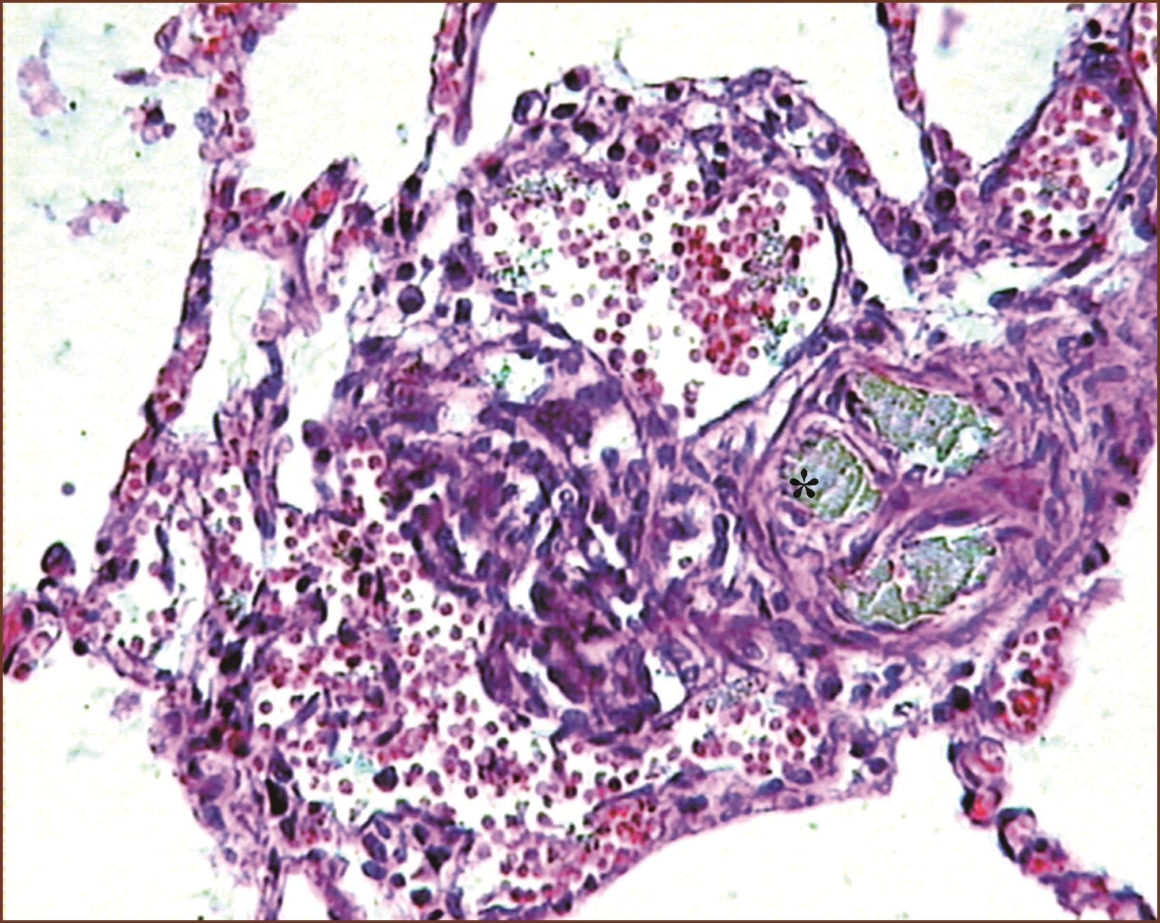 图3-1-16 来自IPAH,图右上方肺小动脉腔呈筛孔状,腔内可见注射的深色钡剂(∗),图中下部的丛状病变裂隙内血管无钡剂,其他薄壁血管为扩张的肺小动脉(HE,高倍放大)