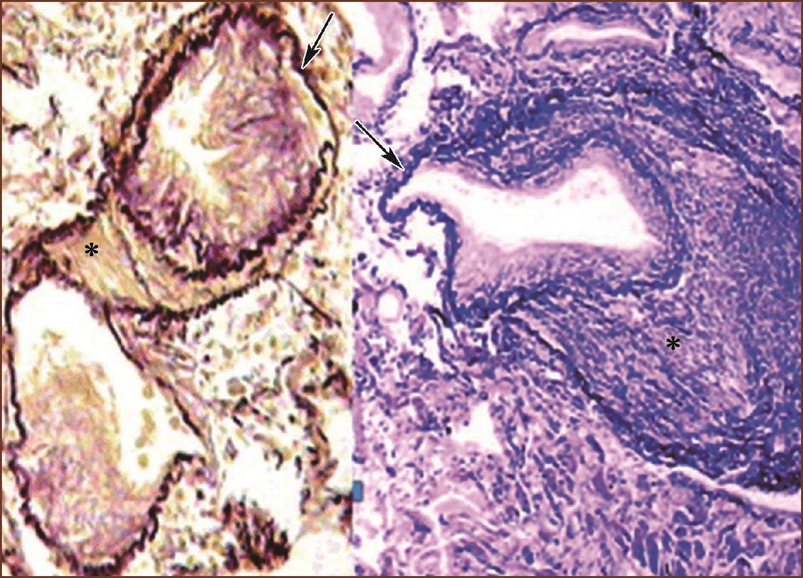 图3-1-18 肺小动脉一侧明显不均匀性增厚(∗),另一侧壁薄似静脉(箭头所示),内膜轻度纤维化(ET+VG, ×200)