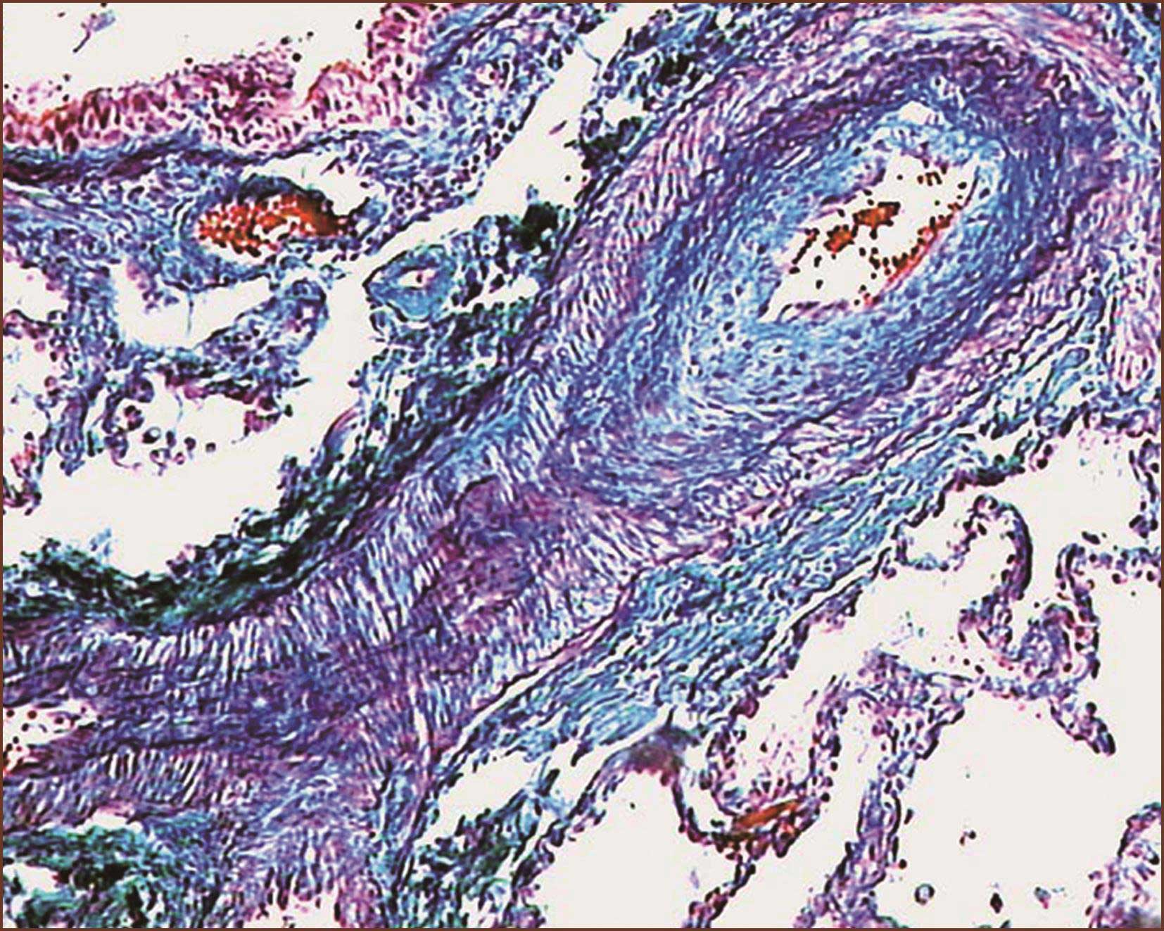 图3-1-3 肺小动脉内膜细胞性增生(Masson染色,中倍放大)