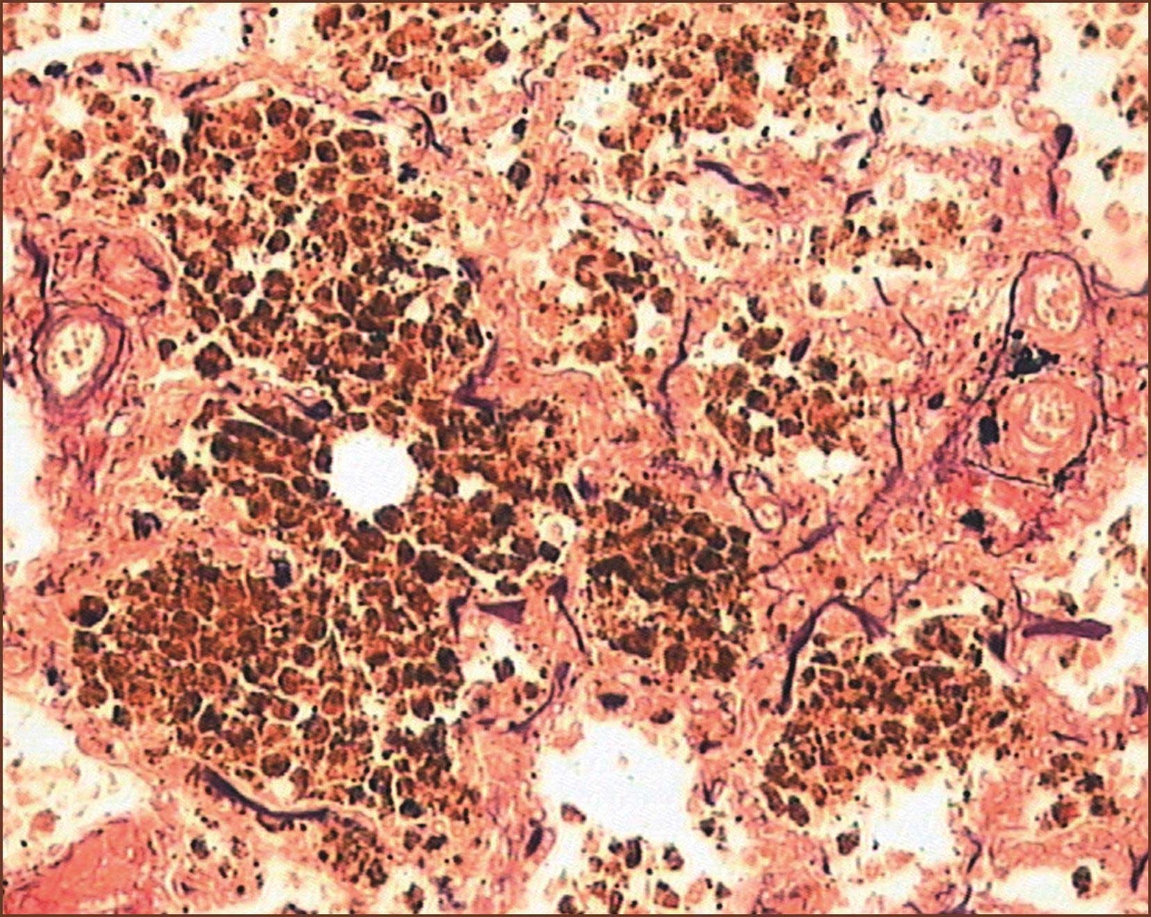 在大多数严重的PAH,肌型肺动脉和肺微细动脉可发生纤维素样坏死(图3-1-10,图3-1-11)。坏死通常是节段性的,可发展成为动脉瘤样破裂,伴发间质或肺泡腔内出血,最终含铁血黄素沉积。局部修复性的重建血管瘤样的结构就是丛状病变(plexiform)。丛状病变是Ⅳ级肺动脉高压的标志。