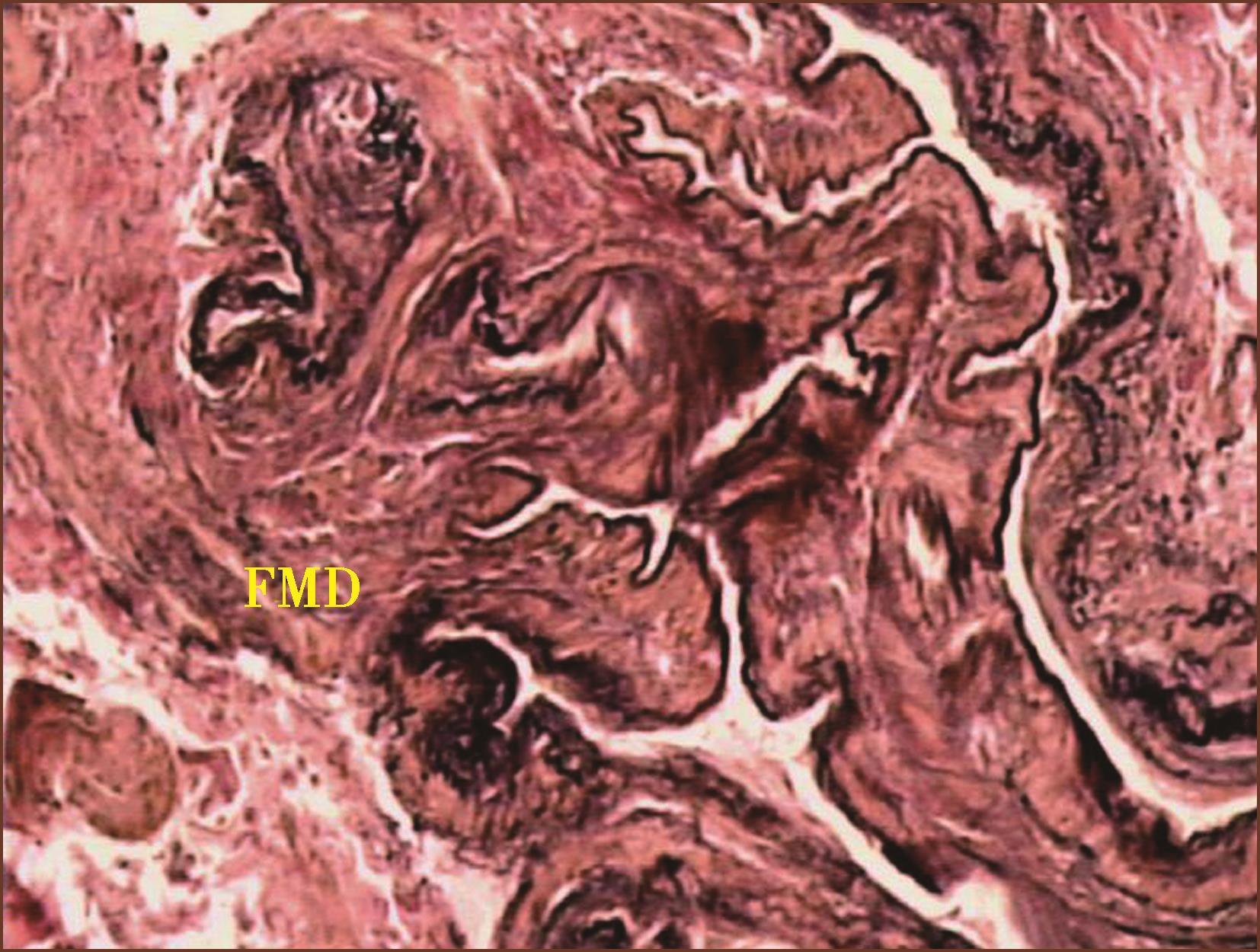 图3-1-17 肺小动脉肌层显著增厚,由自肌层向动脉腔内异常生长的肌纤维、胶原及弹力纤维呈乳头状突向管腔,造成管腔阻塞(ET+VG,×200)。FMD:纤维肌性结构不良