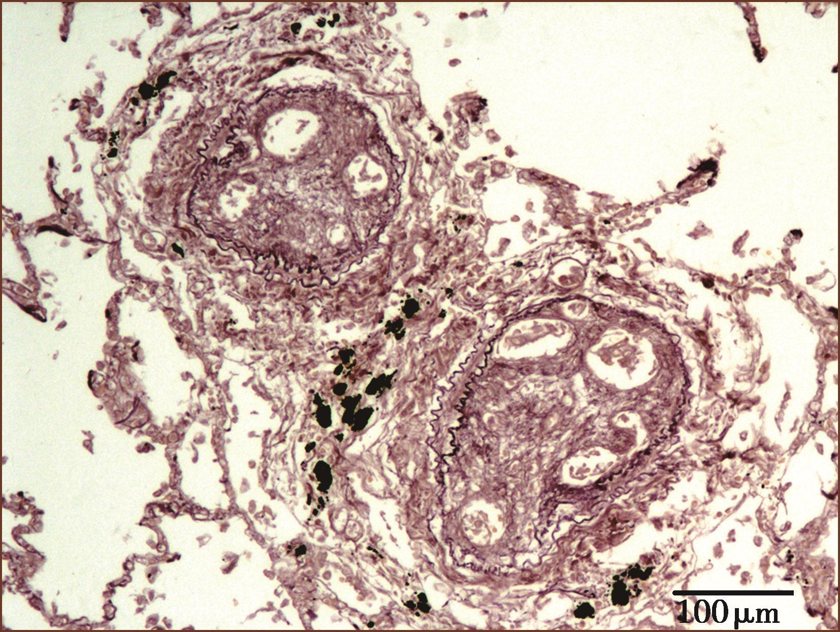 缺氧性肺动脉高压(pulmonary hypertension due to lung respiratory diseases and/or hypoxia)包括慢性阻塞性肺疾病、高原(山)病、间质性肺疾病、睡眠呼吸障碍、肺泡低通气综合征、新生儿肺病、肺泡-毛细血管发育不良、脊柱及胸廓畸形、高度肥胖、特发性含铁血素沉着症等引起的肺动脉高压。缺氧性肺动脉高压对大的肺动脉受影响很少,主要发生肺小动脉中层肥厚,微细动脉肌型化,也可出现肺小动脉内膜纤维化。肺细、小动脉内膜下纵行肌束出现是特征性改变。未见有丛状病变的报道。我们在慢性阻塞性肺疾病导致肺源性心脏病死亡的尸检中查见肺动脉干(占20%)、叶支(90%)的病例有粥样硬化斑块(与慢性肺动脉高压有关),53%有肺细小动脉新旧血栓形成,其中10%的病例出现小灶性急性肺梗死,未发现这些肺梗死患者有体静脉血栓性炎。多数肺小动脉有中层肥厚、内膜纤维化。有的患者既有肺气肿,又合并肺结核或支气管扩张,其肺动脉高压性病变复杂。