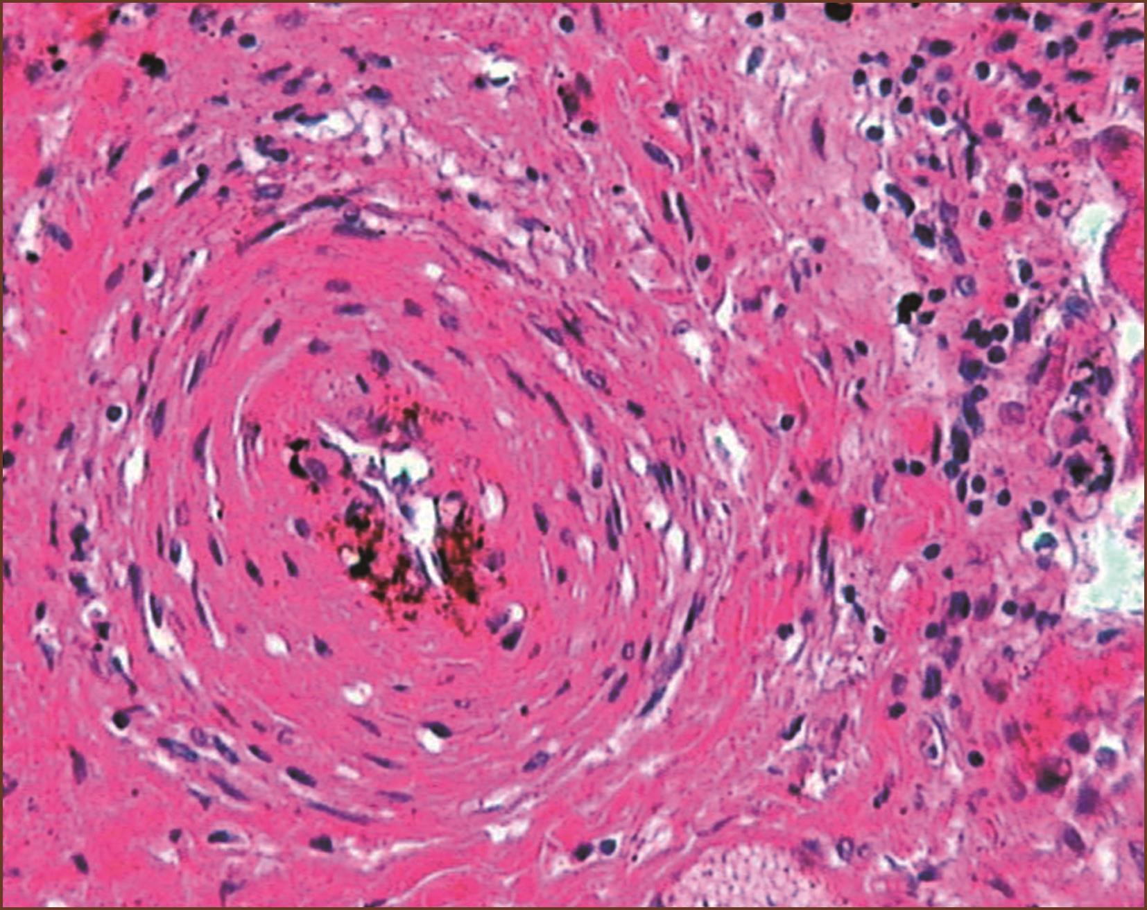 图3-1-5 肺小动脉内膜分层状纤维性增厚(似洋葱断面),管腔重度狭窄(HE×400)