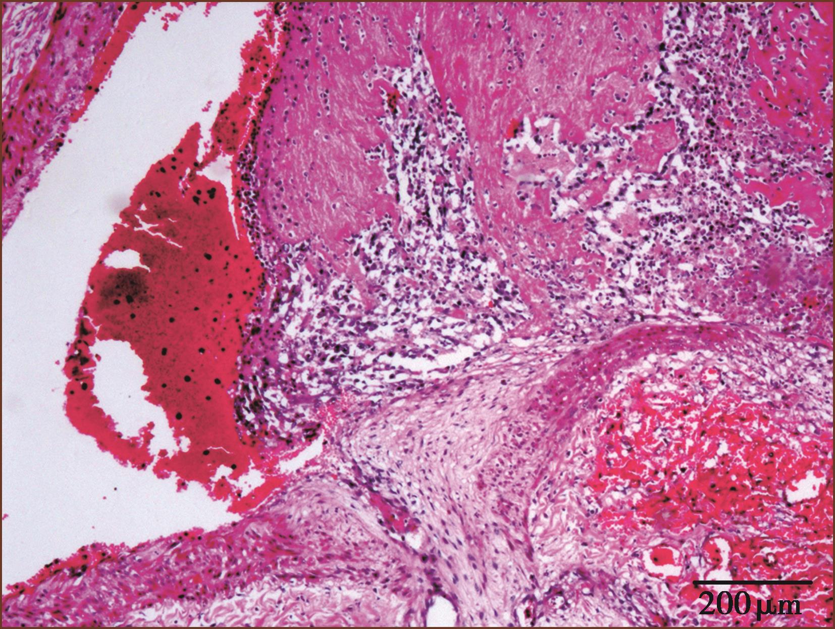 图3-2-4 肺动脉内新鲜及机化血栓(HE,低倍放大)