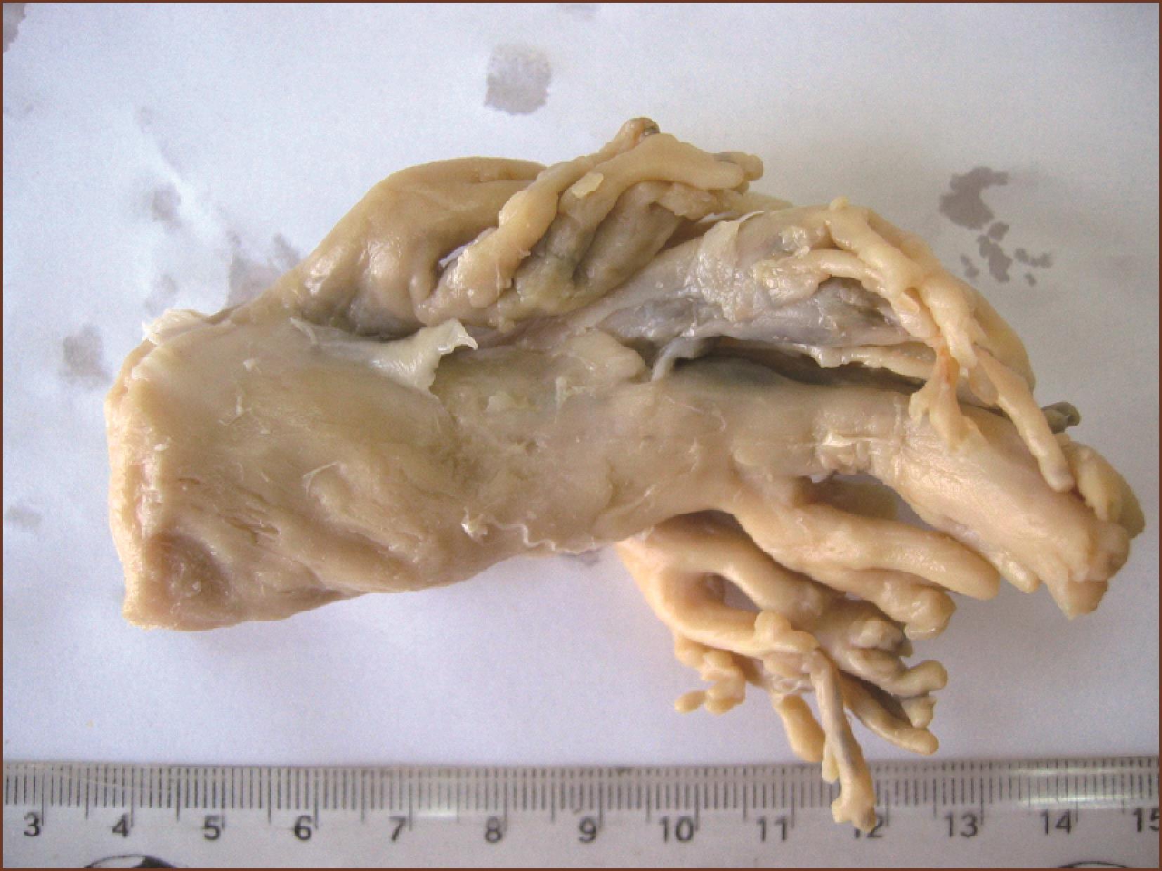 内膜肉瘤大部分是与血管壁相连的管腔内息肉样肿物,和血栓非常相似,因肿瘤常常沿受累血管分支向远端蔓延,故而手术时发现肿瘤呈血管腔铸型(图3-3-5,图3-3-6)