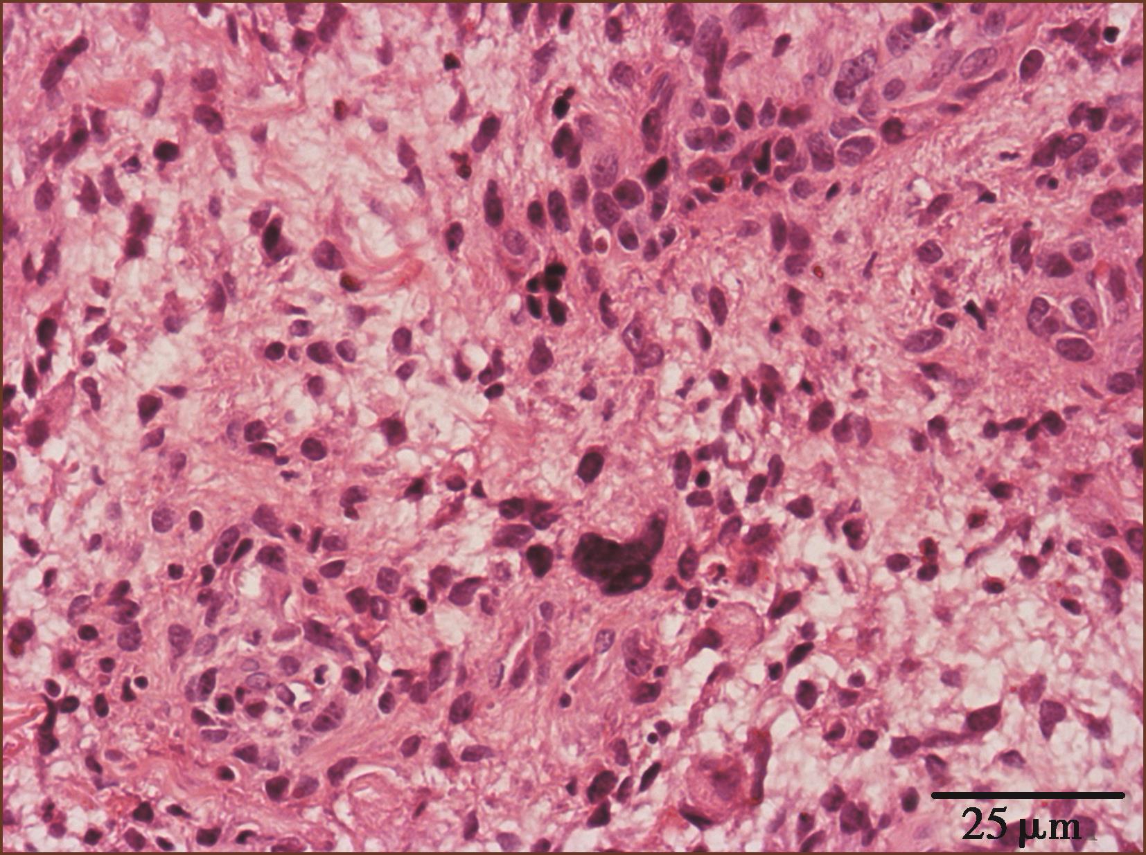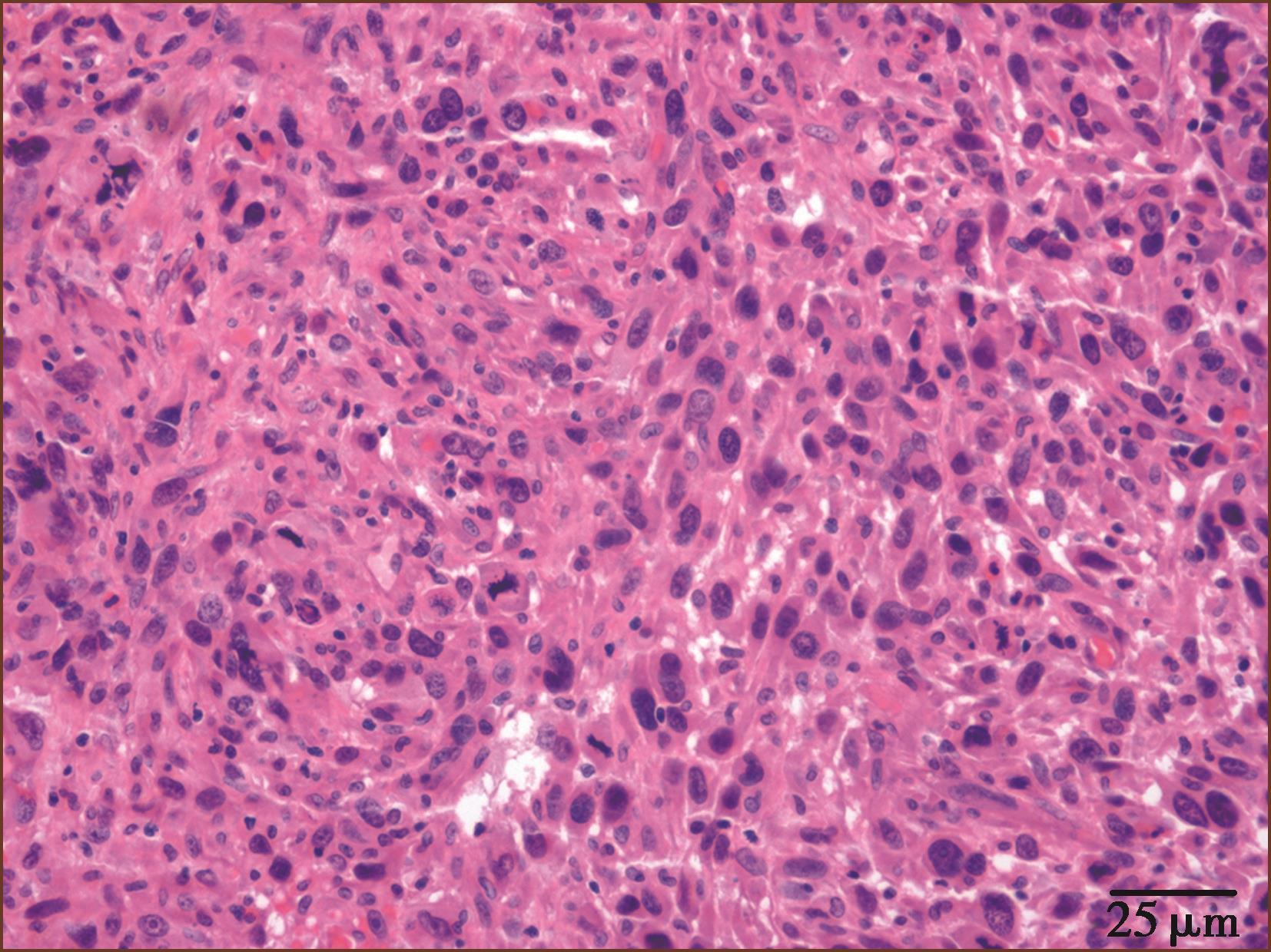 图3-3-7 内膜肉瘤,肿瘤细胞呈短梭形,有些区域细胞呈上皮样,细胞异形性明显,可见瘤巨细胞(HE染色×高倍放大)