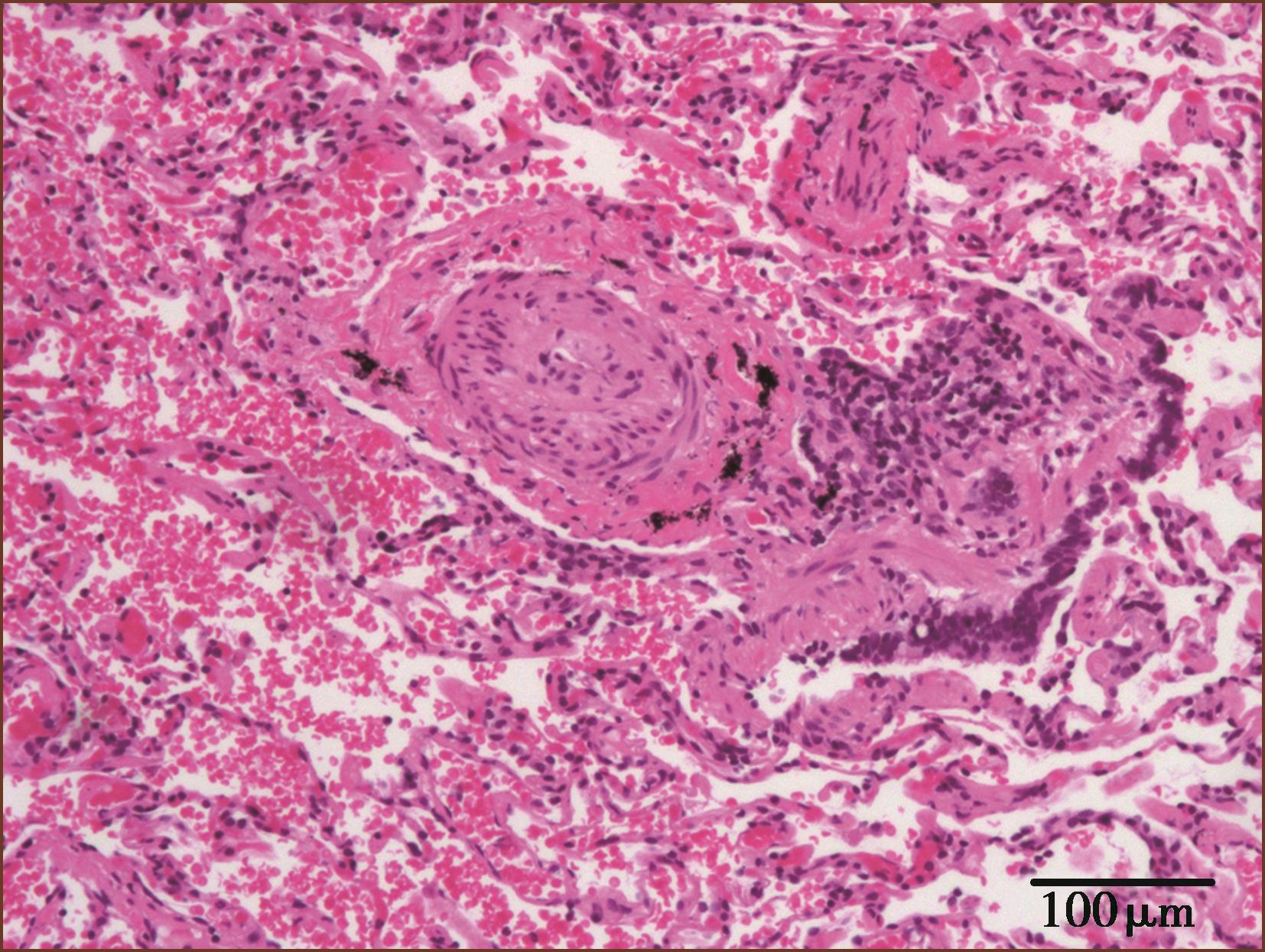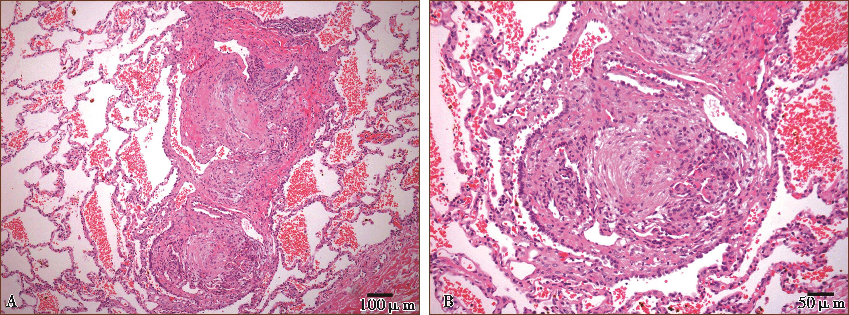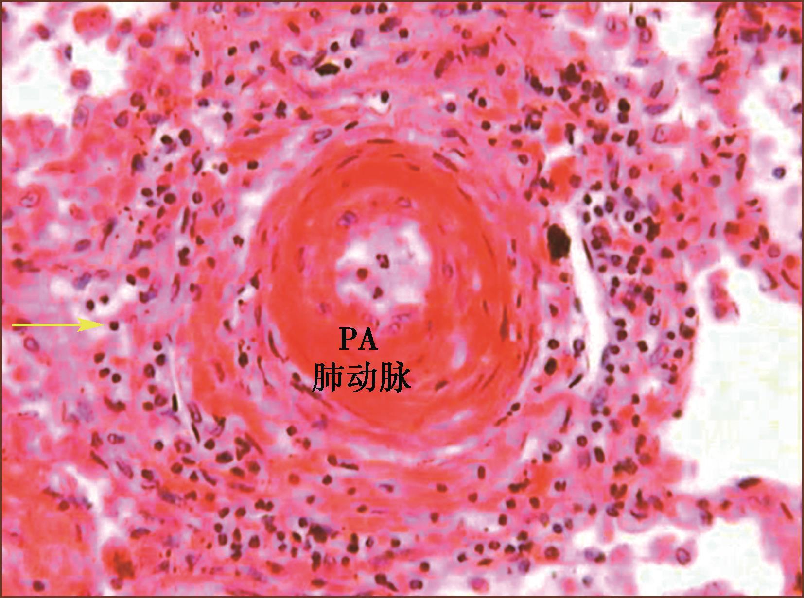 直径大约<500μm的远端肺动脉(small pulmonary artery,sPA)中层肌性肥厚,微细动脉肌型化,内膜纤维性增生增厚可分为向心性、偏心性、非板层状及/或板层状纤维性增厚使管狭窄、闭塞,可并发血栓形成。在重症PAH可出现肺细小动脉丛状病变及扩张性改变,坏死性动脉炎,并可见微血管瘤样增生等。肺小动脉外膜亦可见纤维性增厚。弹力型肺动脉内膜可见内膜粥样硬化;晚期形成右心室肥厚扩张,肺源性心脏病,心力衰竭。