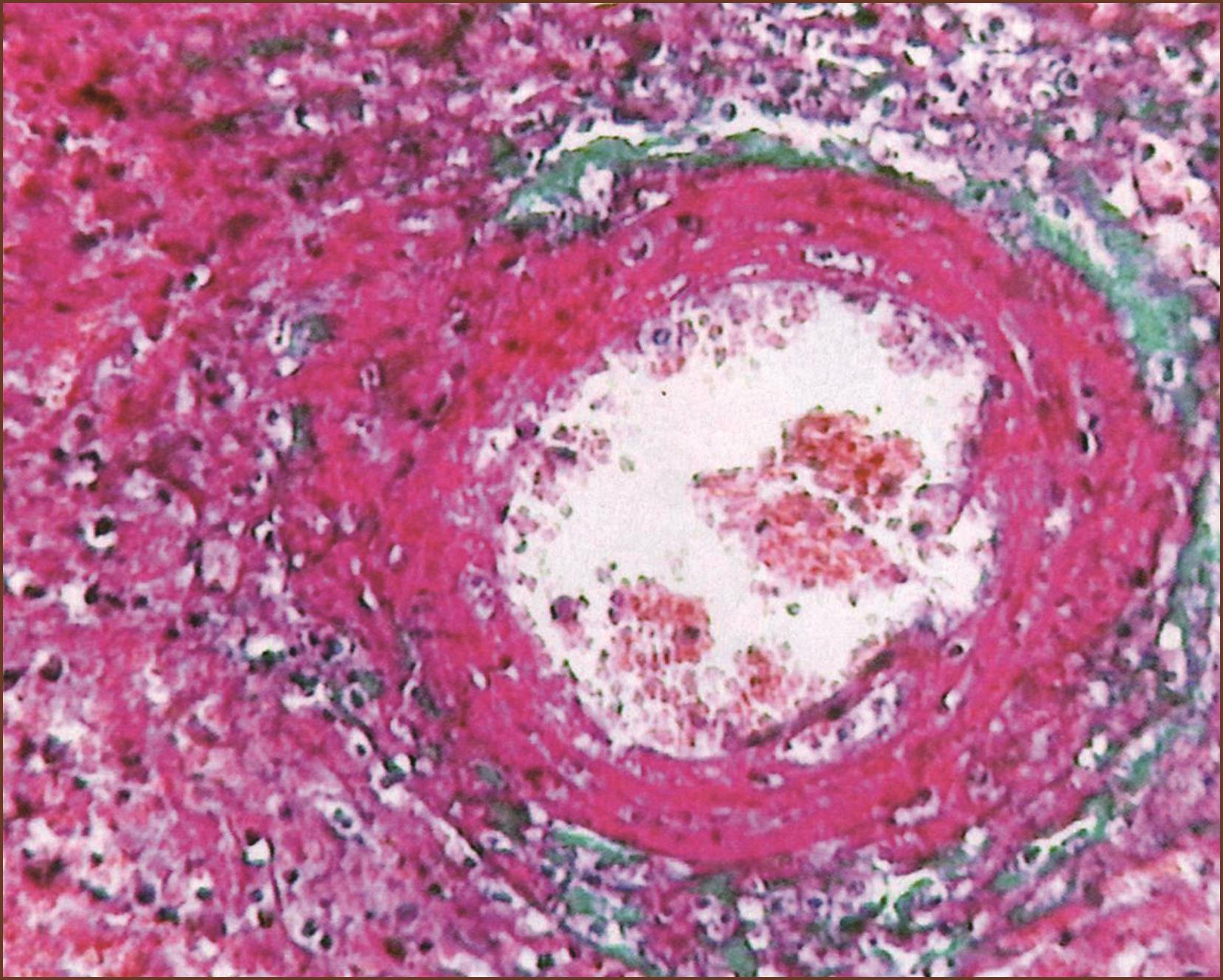 图3-1-9 肺小动脉内膜纤维化合并血栓形成,阻塞管腔(HE×400)