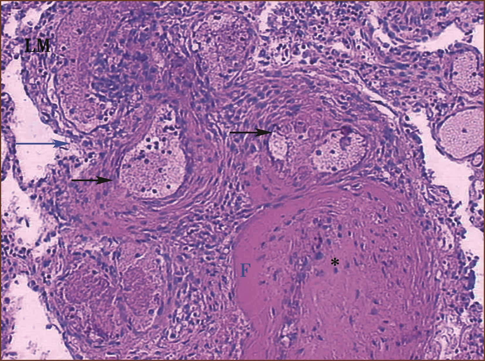 图3-1-14 来自IPAH患者的肺小动脉丛状病变,多个厚薄不一、形状多样的小血管球状及丛状增生,即丛状病变,周围有组织坏死及大量淋巴细胞浸润,为坏死性动脉炎(HE,中倍放大),F:丛状病变