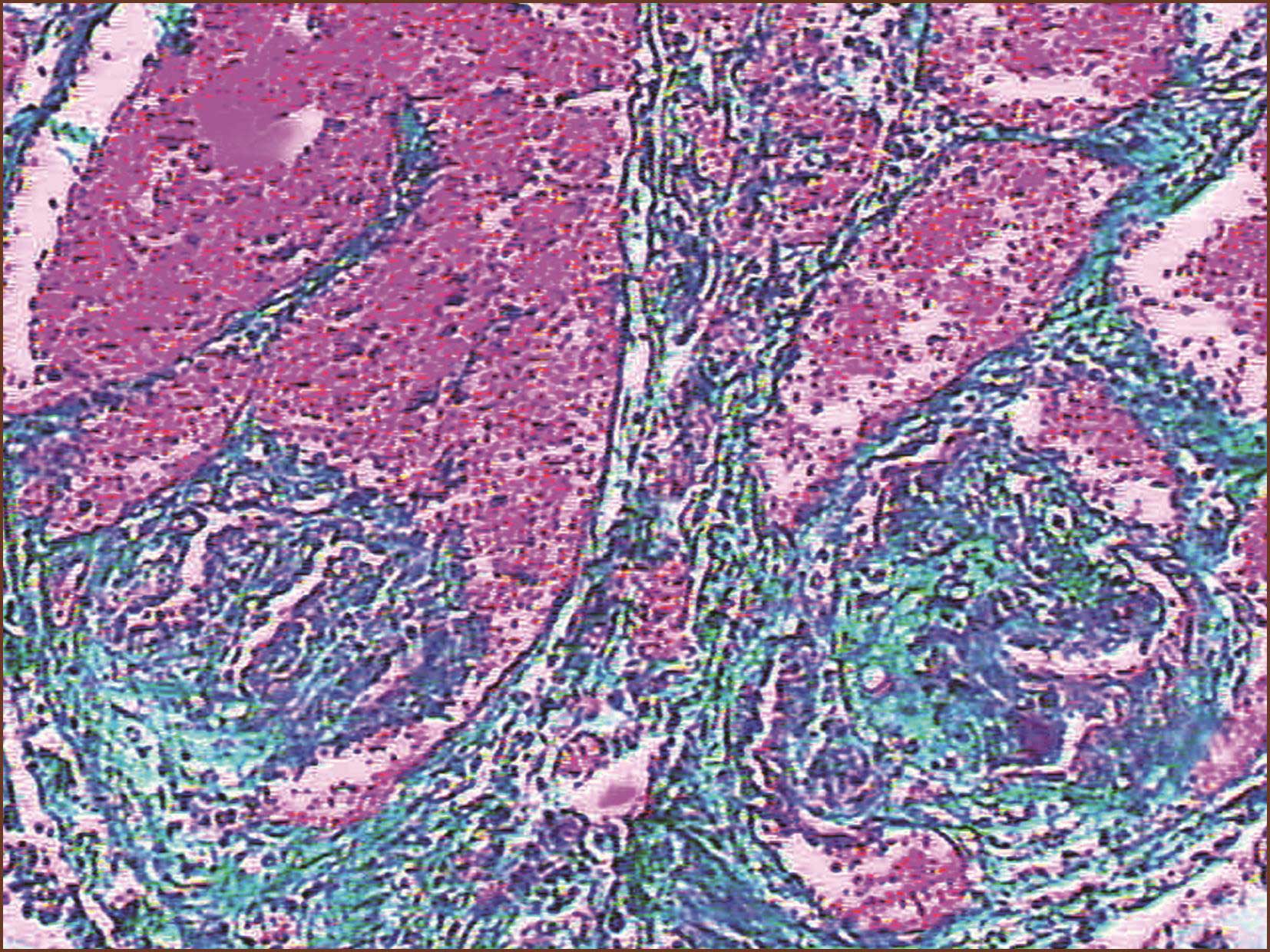 丛状病变组织学显示由无规律生长的内皮细胞团(丛)状增生(有作者认为是肿瘤性内皮细胞增生)(图3-1-12,图3-1-13)。丛状病变组成成分有新生内皮细胞团(丛),混杂有肌纤维母细胞、平滑肌细胞和结缔组织基质,形成灶性薄壁的多个毛细血管裂隙。丛状病变的内皮细胞可被血管内皮生长因子(VEGF)和它的受体标记;用α-SM-Actin可以标记丛状病变内的肌纤维母细胞。有的作者形容丛状病变为血管球样生长。有时,丛状病变的管腔宽大,病变类似动静脉畸形。如果管腔内含有纤维素,要与机化血栓进行鉴别。在临床PAH中,丛状病变在肺活检组织中不易见到。在重症PAH一张组织切片上能见到一两处丛状病变,因此至少应该检查10个肺组织块,才能够除外丛状病变。有研究报道,特发性肺动脉高压的丛状病变为单克隆来源;反之在继发性肺动脉高压的丛状病变是多克隆来源。