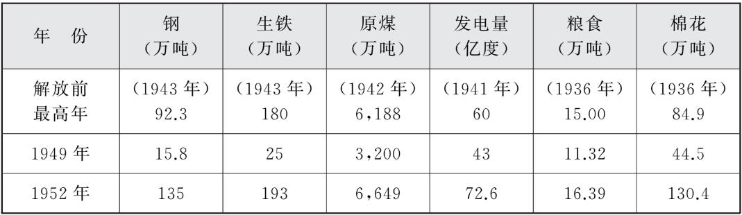 表1-2 1949—1952年三年经济恢复时期主要产品产量与解放前最高年产量对照表