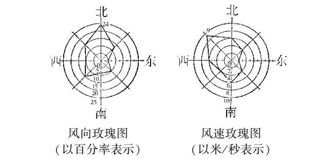 风玫瑰图 简称“风玫瑰”。一地区一定时段内风向、风速的气候图。图形似玫瑰花朵,故名。以8方位或16方位表示。风向玫瑰图表示各风向的频率。如附图中,北风频率约占24%。风速玫瑰图表示各方向风速的分布。如附图中,西北风的风速约为9米/秒。风玫瑰图通常有年、季和月等多种,为城市规划、建筑设计和气候研究中所常用。
