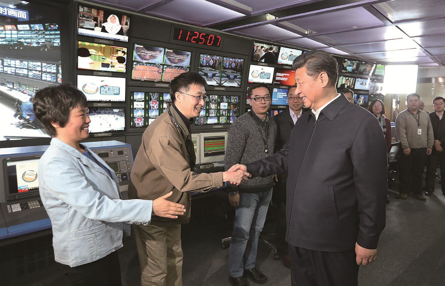 2016年2月19日,习近平在北京主持召开党的新闻舆论工作座谈会,并到中央新闻单位调研。这是习近平在中央电视台总控中心同工作人员交流。