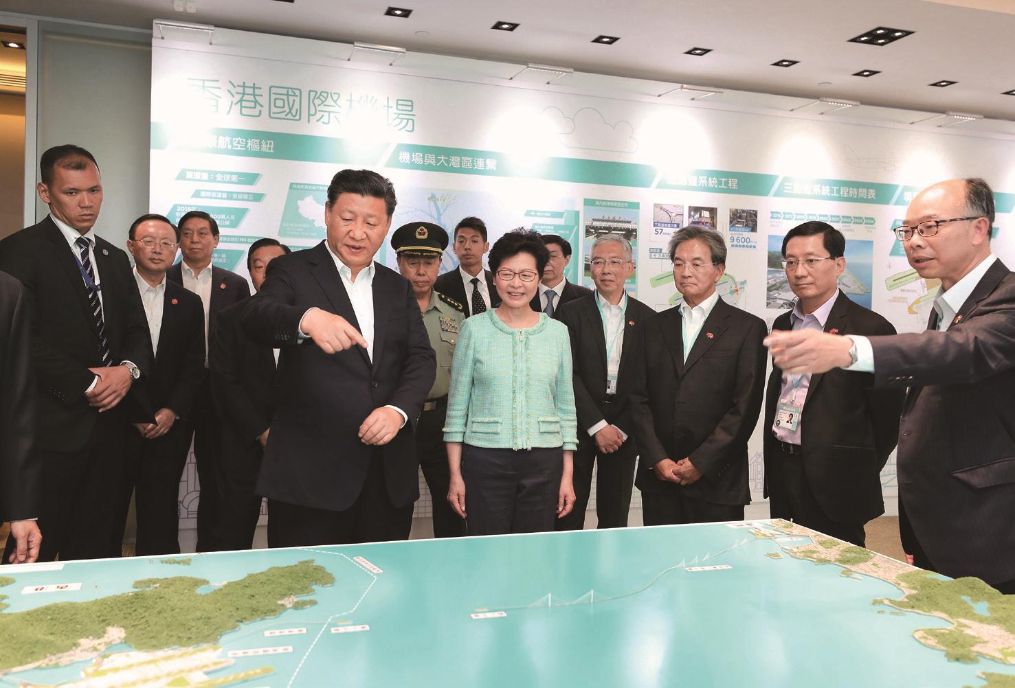 2017年7月1日,习近平在出席庆祝香港回归祖国20周年大会暨香港特别行政区第五届政府就职典礼后,在香港特别行政区行政长官林郑月娥陪同下,考察香港国际机场第三跑道建设情况。