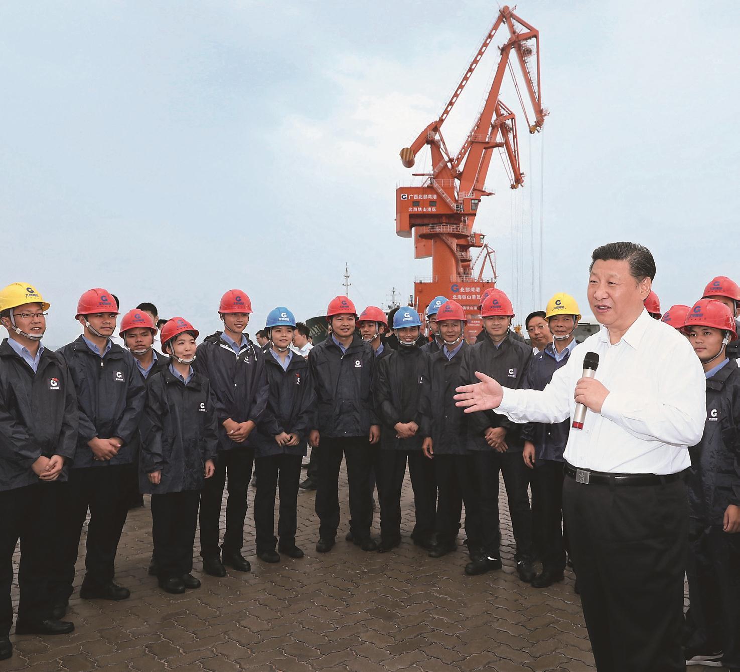 2017年4月19日,习近平在广西北海市铁山港公用码头,看望在现场作业的工人们。