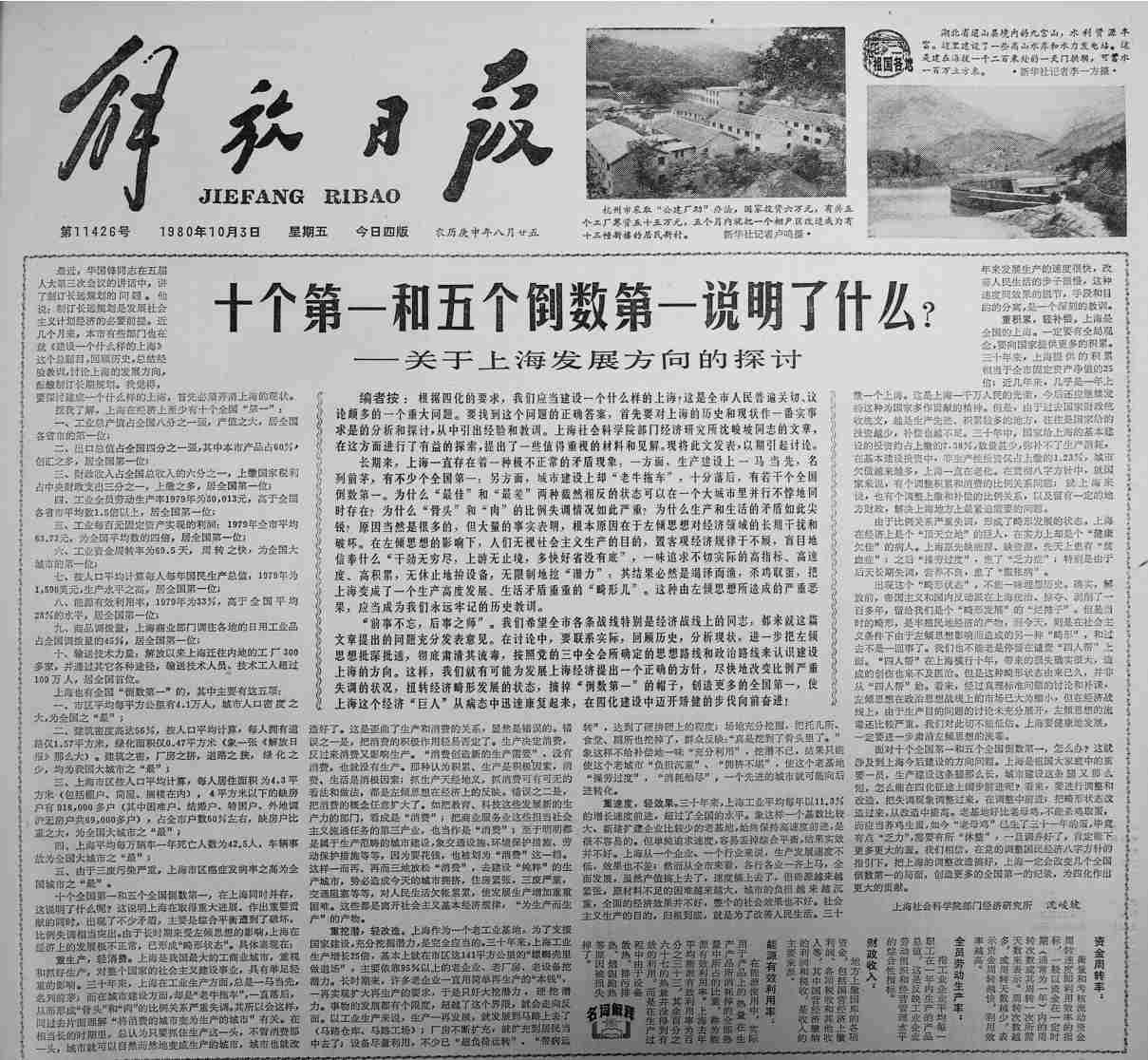 1980年10月3日,《解放日报》刊登《十个第一和五个倒数第一说明了什么?——关于上海发展方向的探讨》(顾征宇摄)