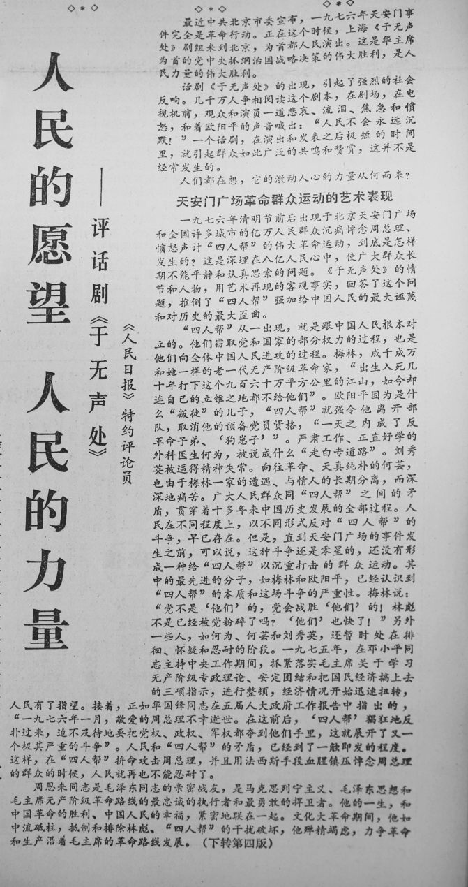 1978年11月16日《人民日报》刊登《人民的愿望 人民的力量——评话剧〈于无声处〉》(顾征宇摄)