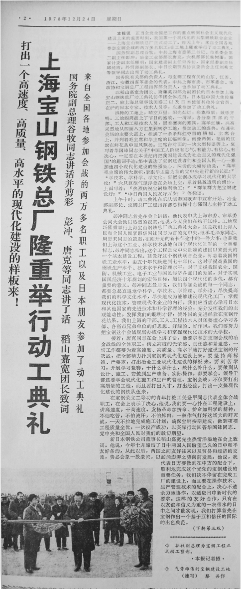 1978年12月24日,《解放日报》刊登《上海宝山钢铁总厂隆重举行动工典礼》(顾征宇摄)