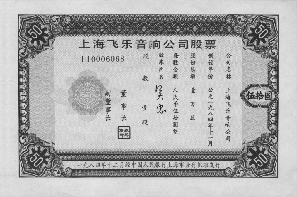1984年11月18日,上海飞乐音响股份有限公司在锦江饭店举行了成立仪式。当日下午,《新民晚报》头版刊登了这则消息:上海飞乐音响公司18日开业接受个人和集体认购股票,发行1万股,每股50元。当年12月,飞乐公司正式由上海静安证券营业部代理发行股票1万股,共计50万元。发行的地点就安排在飞乐公司收发室,股票发行的当天盛况空前,排队购买股票的市民把附近的几条马路都堵得水泄不通,发行人员背着钱箱、股票箱,当场收钱、开票,原定的50万元发行额度,很快销售一空。