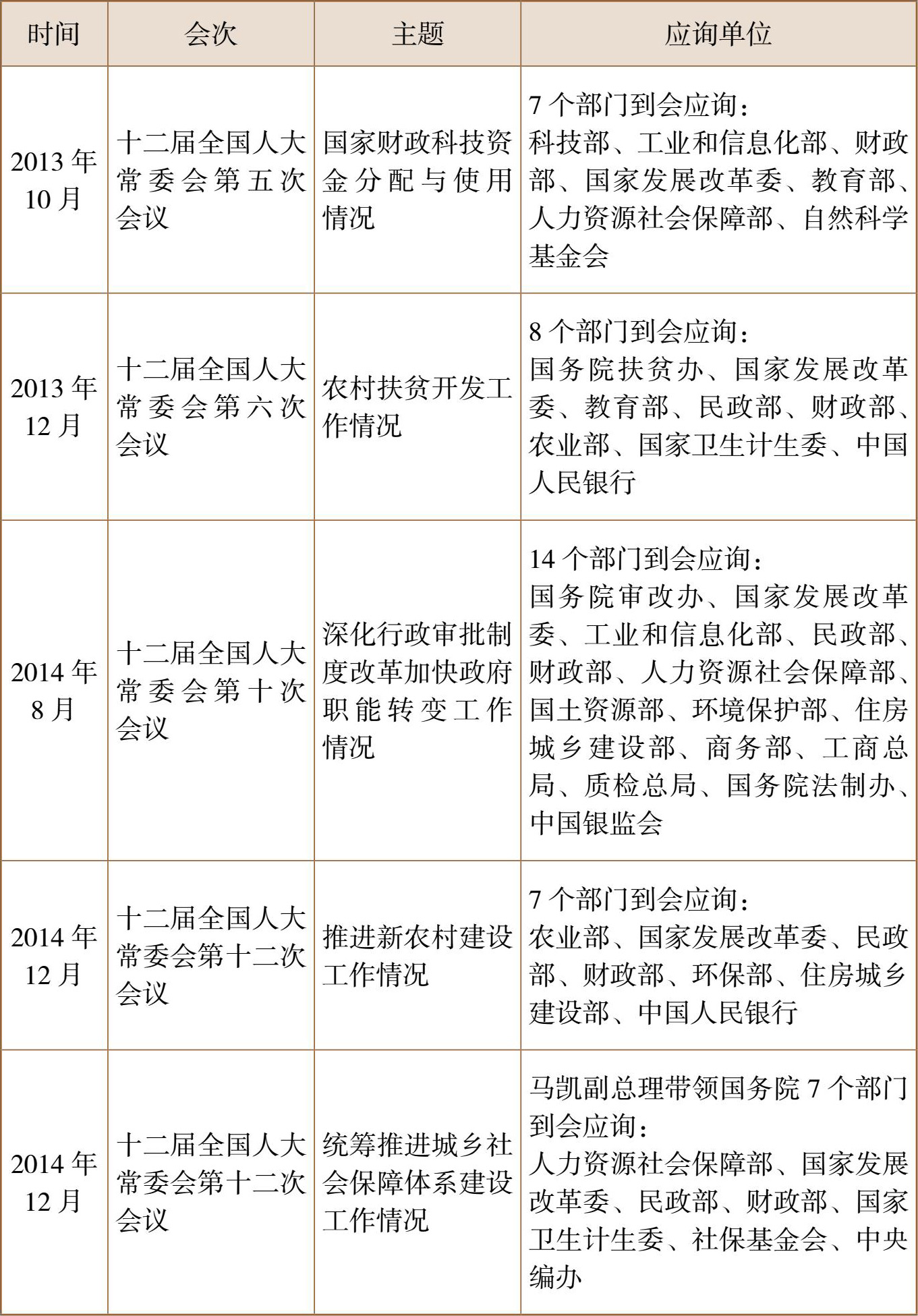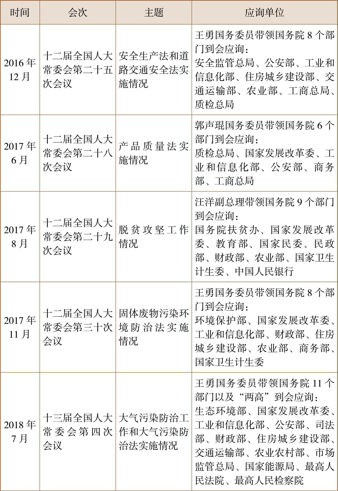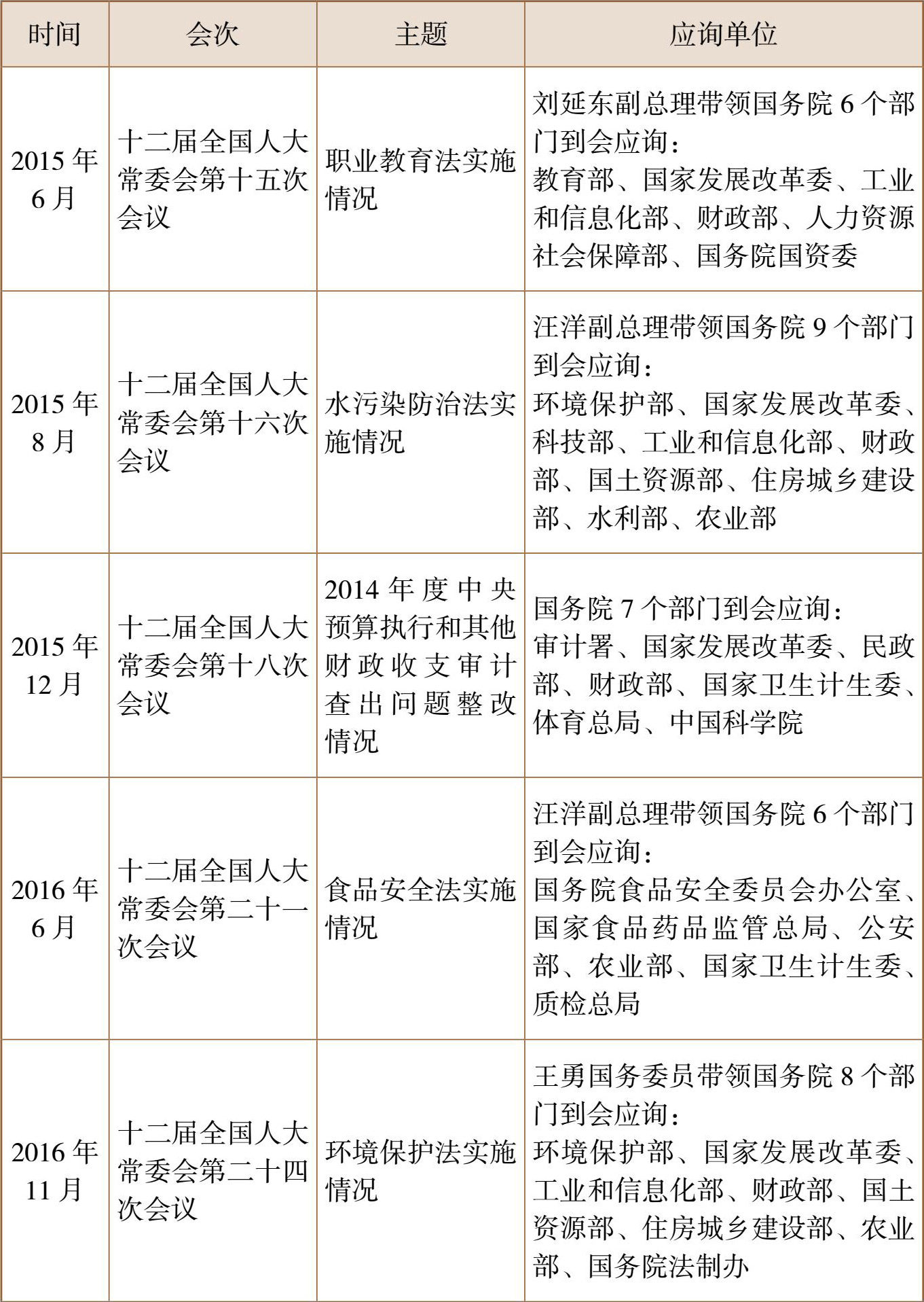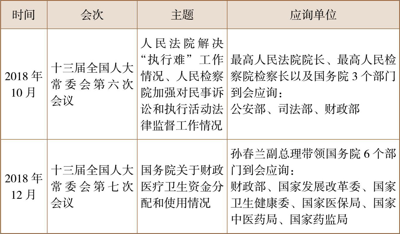 表2 2015年4月—2018年12月《关于改进完善专题询问工作的若干意见》出台后全国人大常委会开展的12次专题询问
