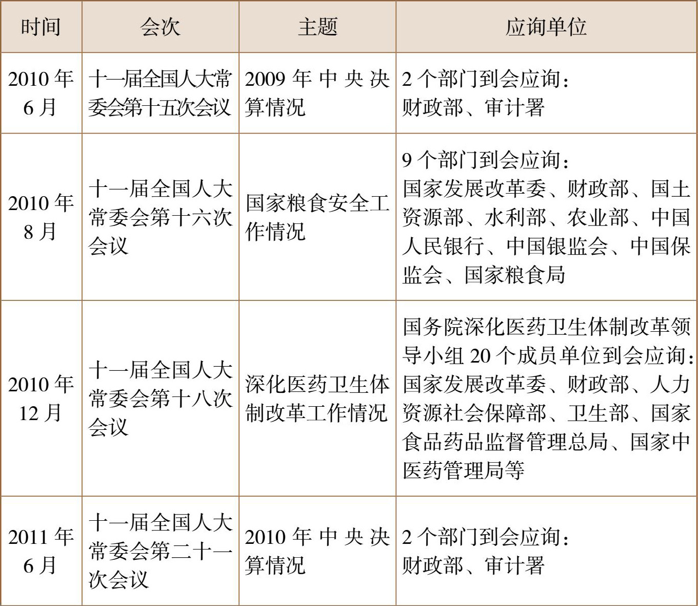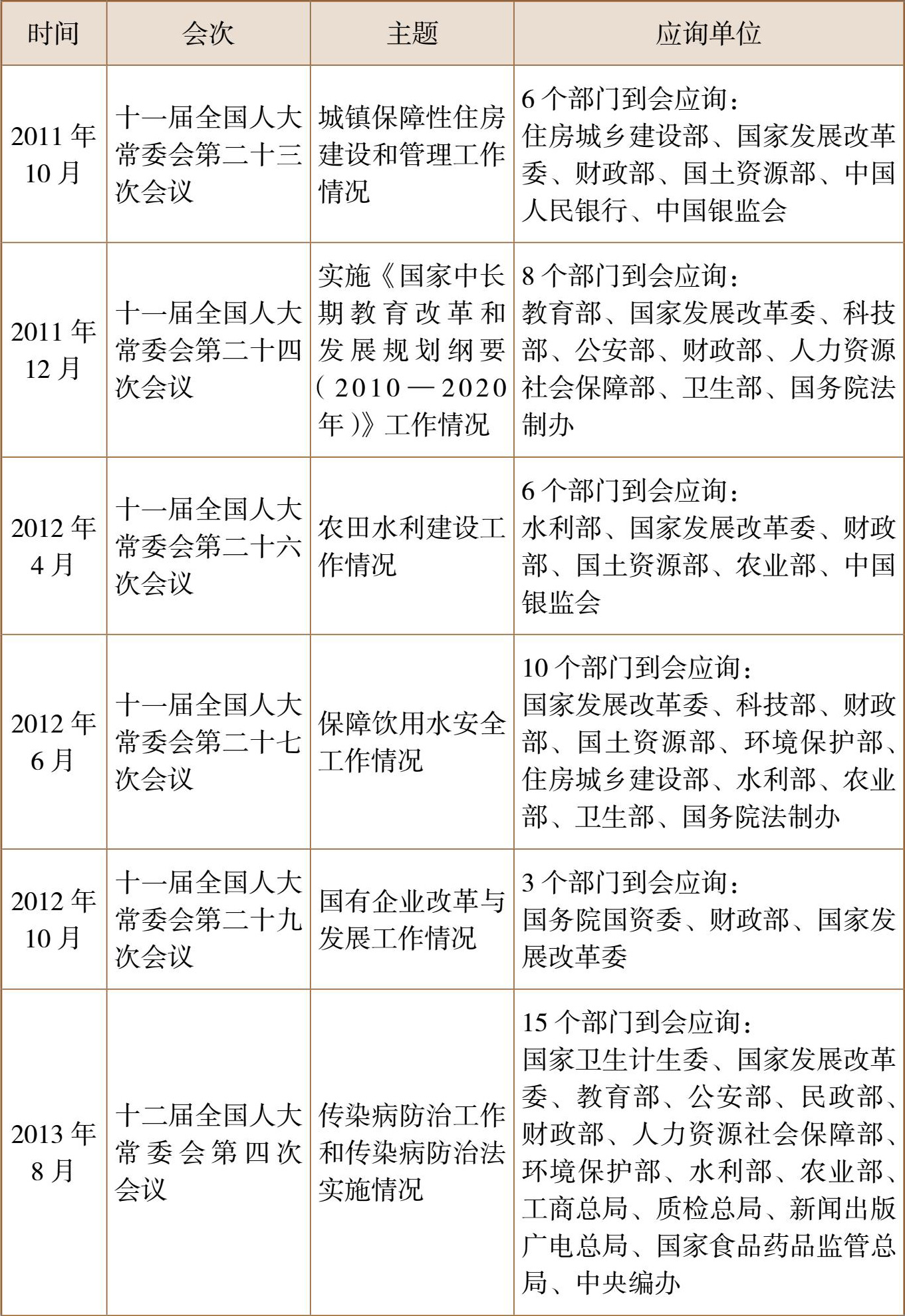 表1 2010年6月—2015年4月《关于改进完善专题询问工作的若干意见》出台前全国人大常委会开展的15次专题询问