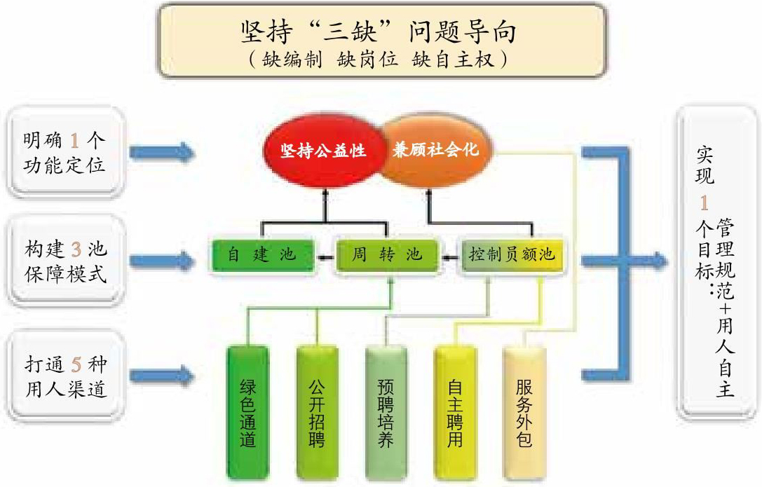 公立医院编制周转池制度,着眼解决公立医院“缺编、缺岗、缺自主”的“三缺”问题,确立了“1351”制度构架(即明确1个功能定位、构建3个池子保障、打通5种用人渠道、实现1个目标)。“1个功能定位”就是明确公立医院坚持公益性、兼顾社会化的功能定位;“3个池子保障”就是建立统筹存量编制的周转池、单位自有编制的自建池、社会化用人的控制员额池;“5种用人渠道”就是选人用人的绿色通道、公开招聘、预聘培养、自主聘用和服务外包;“1个目标”就是实现公立医院管理规范和用人自主。公立医院编制周转池制度,已覆盖省市县三级199家公立医院,核定周转池编制5.4万名,核定社会化用人员额6.6万名。