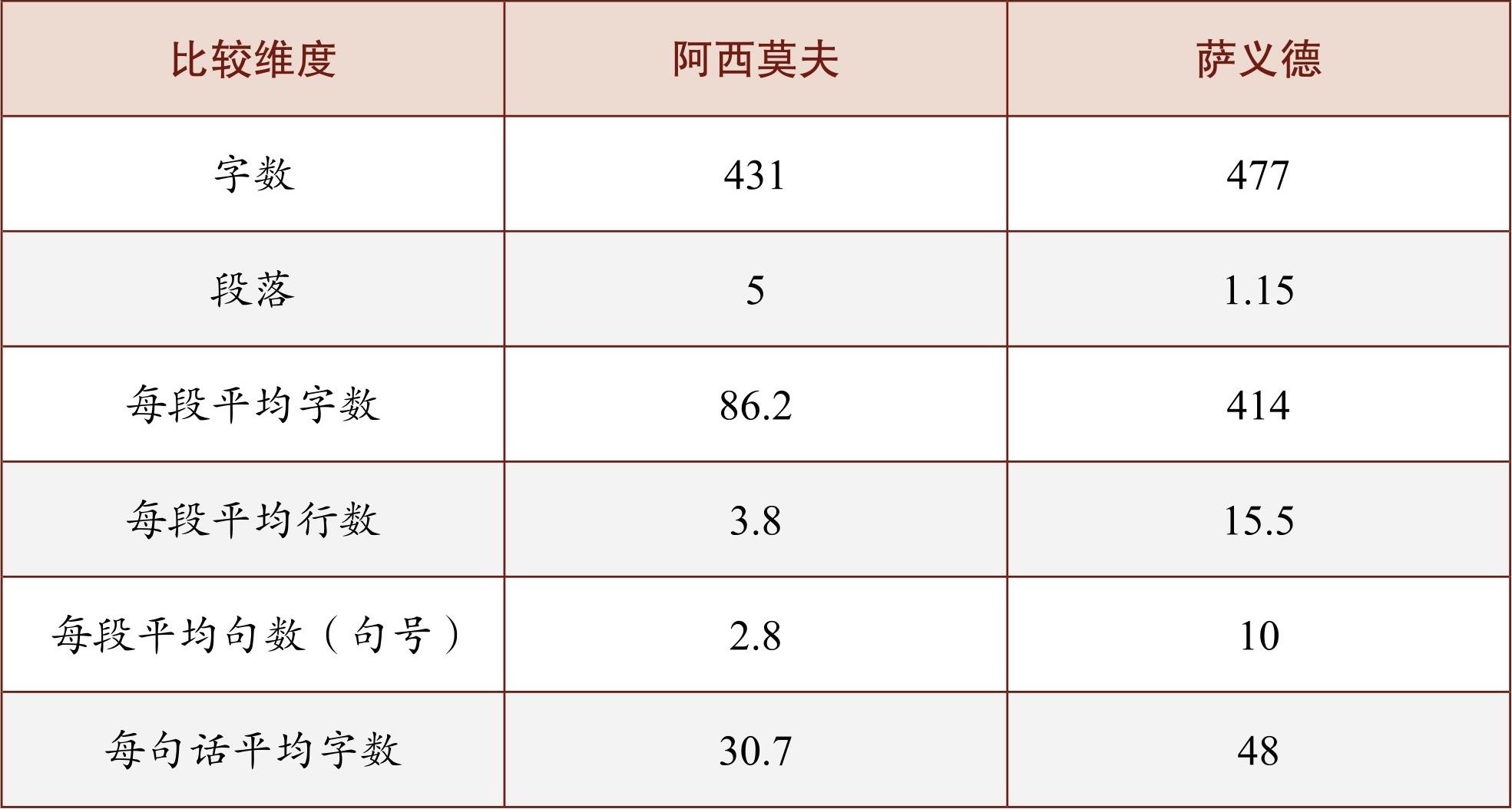 我又逐一计算了他们的行数和句数。差别同样很大:阿西莫夫每段平均有3.8行,2.8句。相应地,每句话平均只有30.7字。而萨义德每段则平均有15.5行,平均每段10句话。相应地,每句话平均长度为48字。