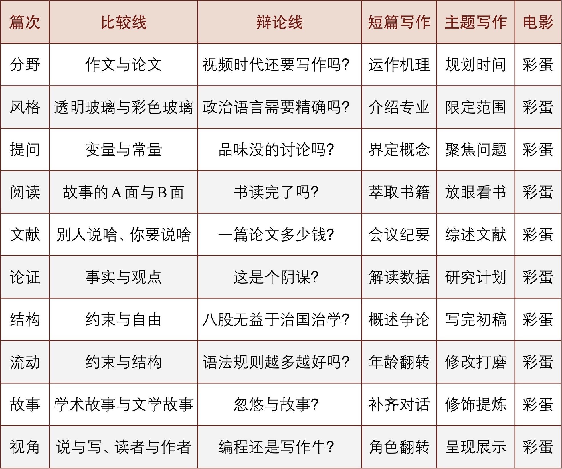 十篇内容是一个有机整体。如上文对各篇章内容的介绍,各篇顺序考虑了说理写作的要素和写作过程,在此不再赘述。另有六条线索紧织成写作网把读者编入“竞技赛道”(比较线),推动读者产生“思维旋涡”(议题辩论),引领读者开动“头脑风暴”(短篇写作和主题写作),希望读者最终会流连于影视天堂和阅读时空。