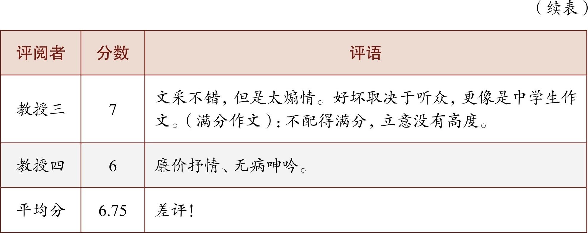 为什么两组的评价差别这么大?教授们都给了差评,话也说得难听。尽管两组评委的选取没有代表性,但是差别并非偶然。这背后实际上反映了不同的写作方式。第一组评委反映了比较传统的写作方式。而第二组的评委普遍受过科学写作训练,对传统写作方式有充分的反思。中国的基础教育比较注重文采和抒情,但弱于说理和论证。现代的科学写作风格,则要求一切以证据为基础,讲求语言的清晰而非绚丽,讲求逻辑的周延而非随便发挥,追求说服力而不是充沛的情感。
