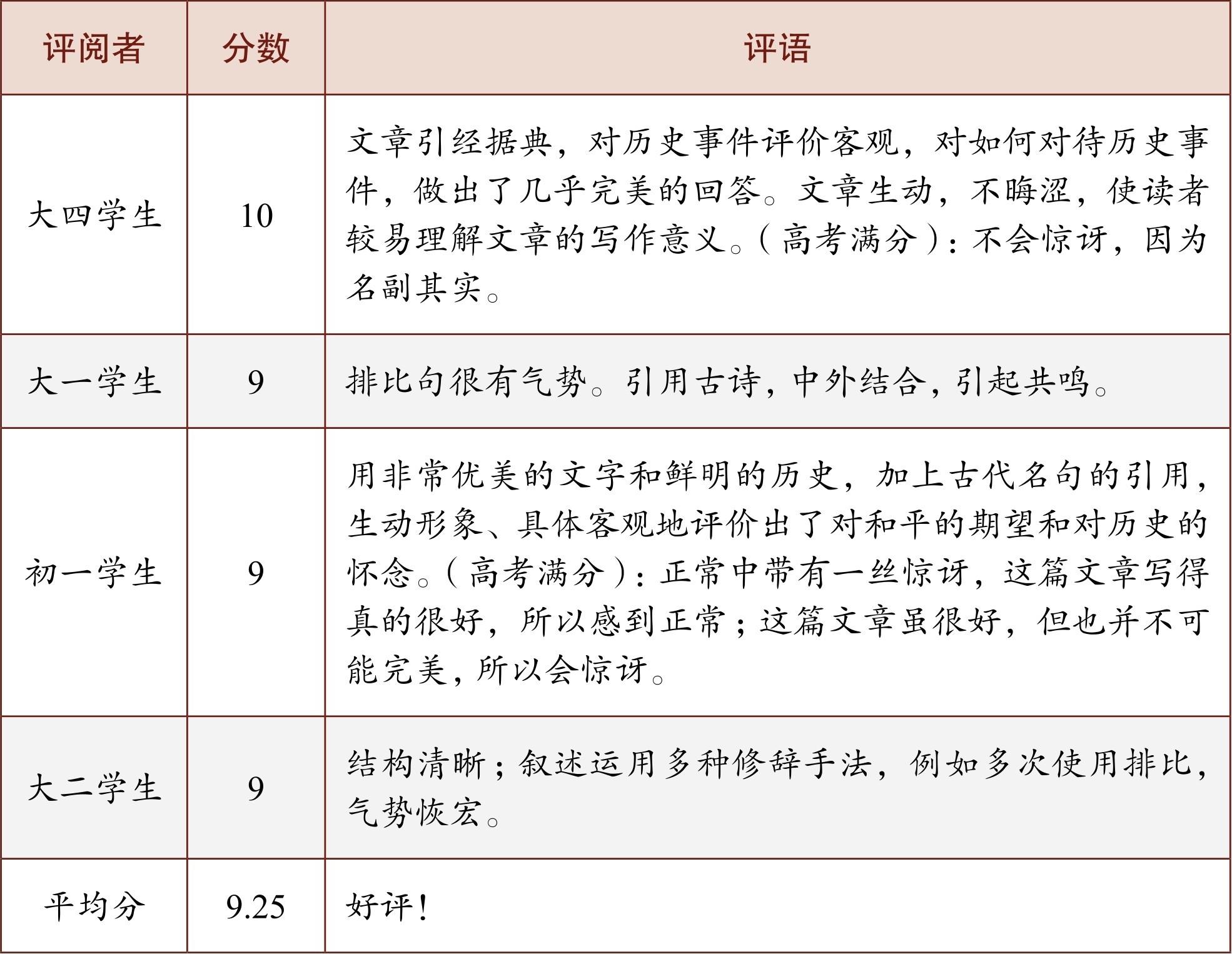 本着“严肃+娱乐”的精神,我邀请了两组评委来给这篇文章打分,而不是像高考作文一样只有两个评阅人。第一组包括初一学生、大一、大二、大四学生各一名。第二组包括四名教师,分别来自耶鲁大学、中山大学、上海交通大学和中山大学。第二组里面包含一位曾经的高考作文评阅人(身份保密)。