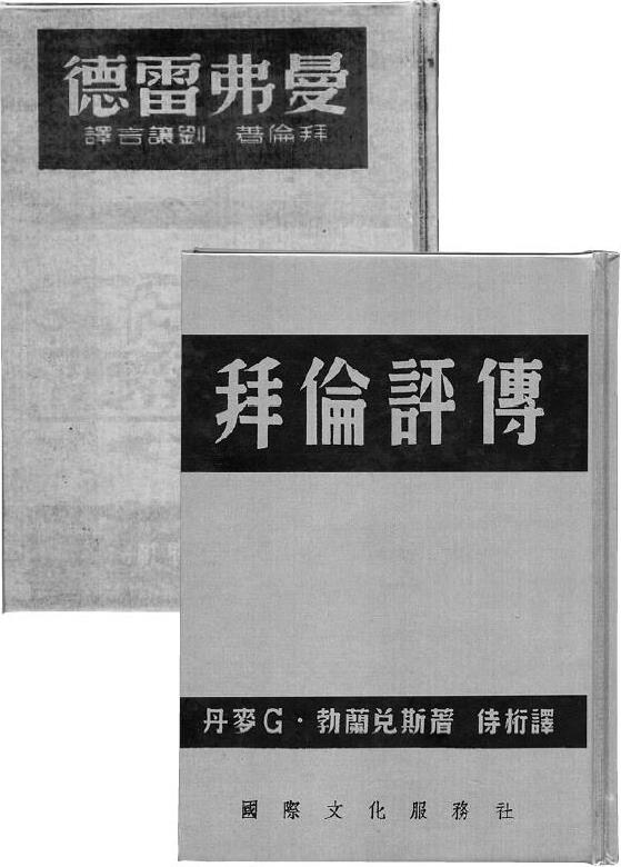 民国版《拜伦评传》和拜伦著作《曼弗雷德》。木心推崇的丹麦大评论家勃兰兑斯、翻译家韩侍桁的名字,出现在封面上。