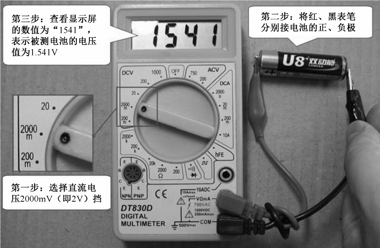 下面通过测量一节电池的电压值来说明直流电压的测量,如图3-11所示,具体过程说明如下所述。