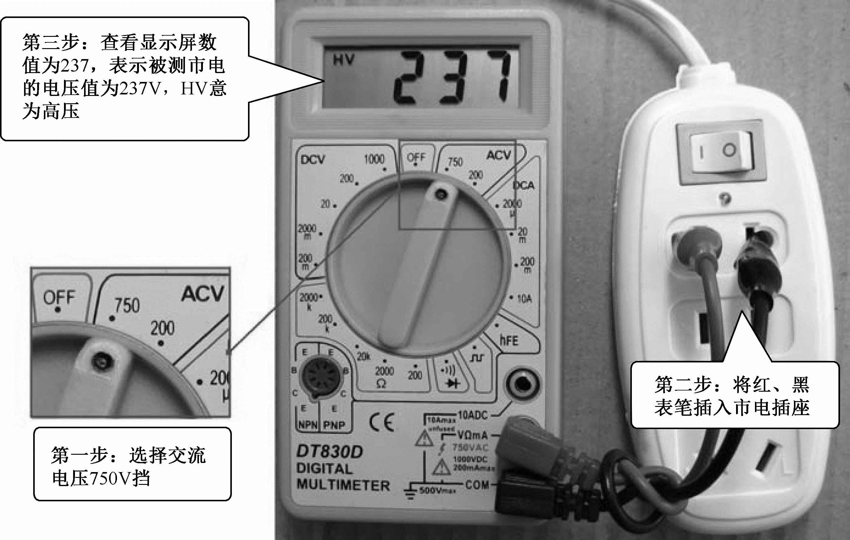 DT-830型数字万用表的交流电压挡具体又分为200V和750V挡。
