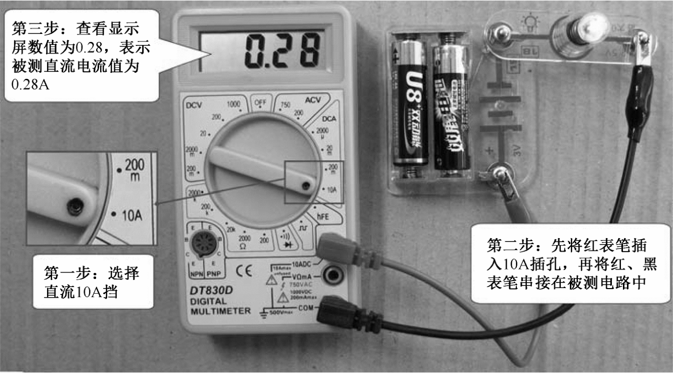 下面以测量流过灯泡的电流大小为例来说明直流电流的测量,如图3-13所示,具体过程如下所述。